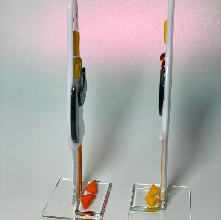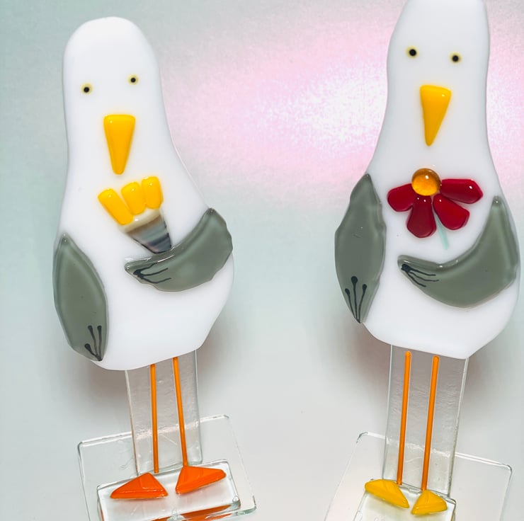 Cute and quirky Fused glass seagulls are often found in my glass pictures but I wanted to try a handful of stand up fused glass ornaments . These cute. Haps are each slightly unique and make wonderful gifts- . The fused glass seagull is created in the kiln in one firing but then has the glass base cold fused . These are a must for all you seagull lovers out there ! This is for mr chips and mrs flower . Mr chips stands approximately 8 inch tall . Slight variations will occur due to hand made nature of the items