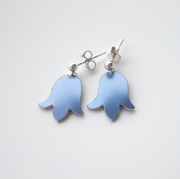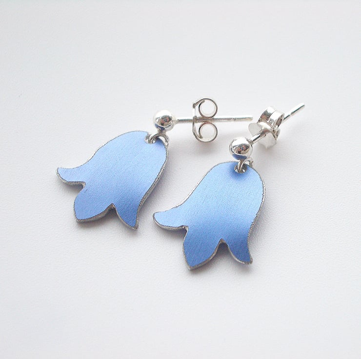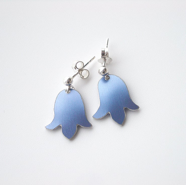 These sweet little bluebell earrings are made from aluminium which I have dyed a lovely purpley blue and sealed so that the colour becomes a permanent part of the metal. I have cut out the bluebell shapes using a jeweller's saw and filed the edges to give a smooth finish. Finally I have domed the bluebells and attached them to a sterling silver stud with a little loop attached so that it dangles just like a real bluebell.