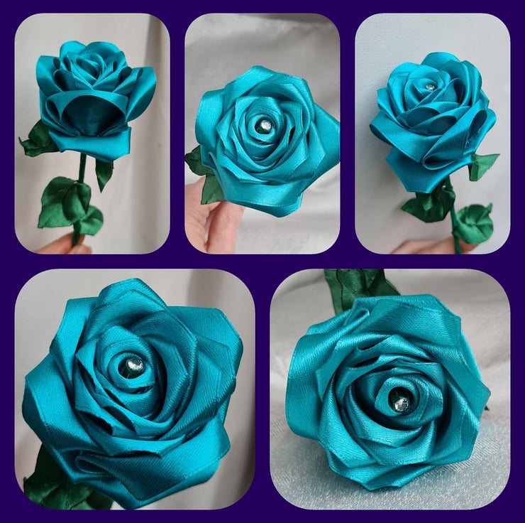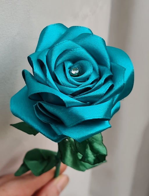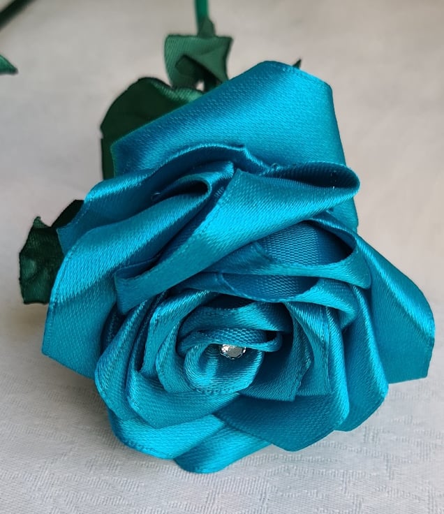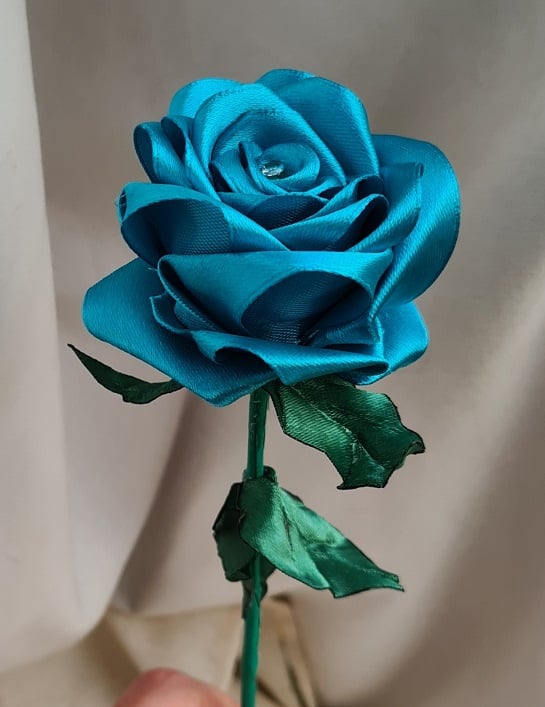 A gorgeous handmade single stem rose (one flower only), made with beautiful Turquoise Satin (Polyester) ribbon. The stem is made from bamboo (Non-bendy) and wrapped in Green tissue paper with Dark Green Satin ribbon leaves. A gorgeous artificial flower gift.