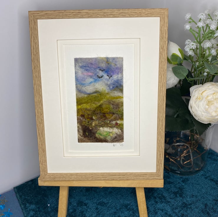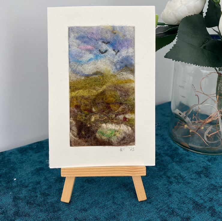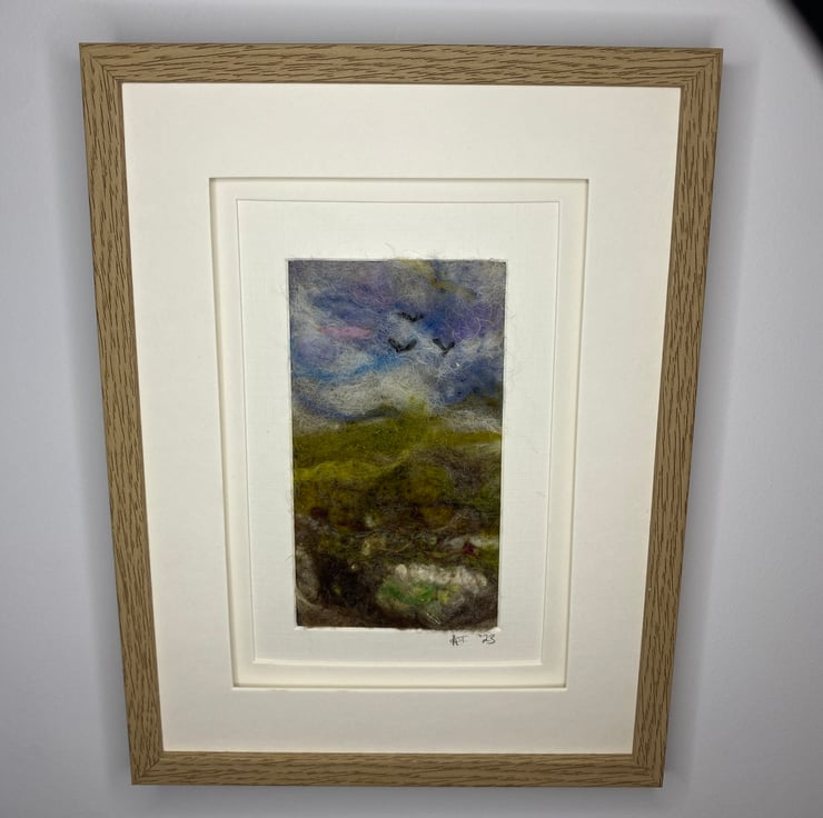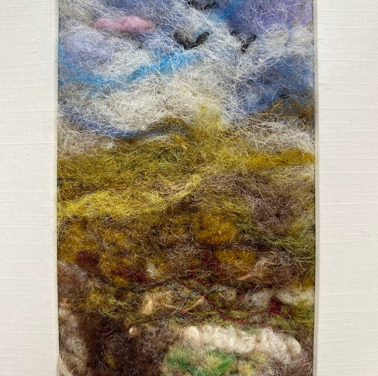 Landscape created by layering merino wools over a wool base. The wools are knitted together using a barbed needle to bond the wools and blend the colours, creating this landscape.
