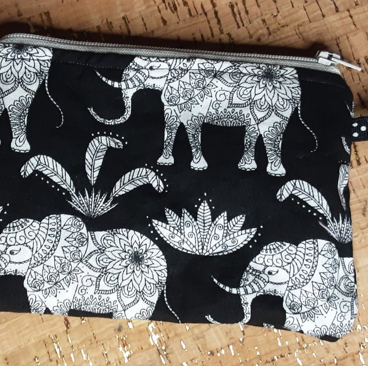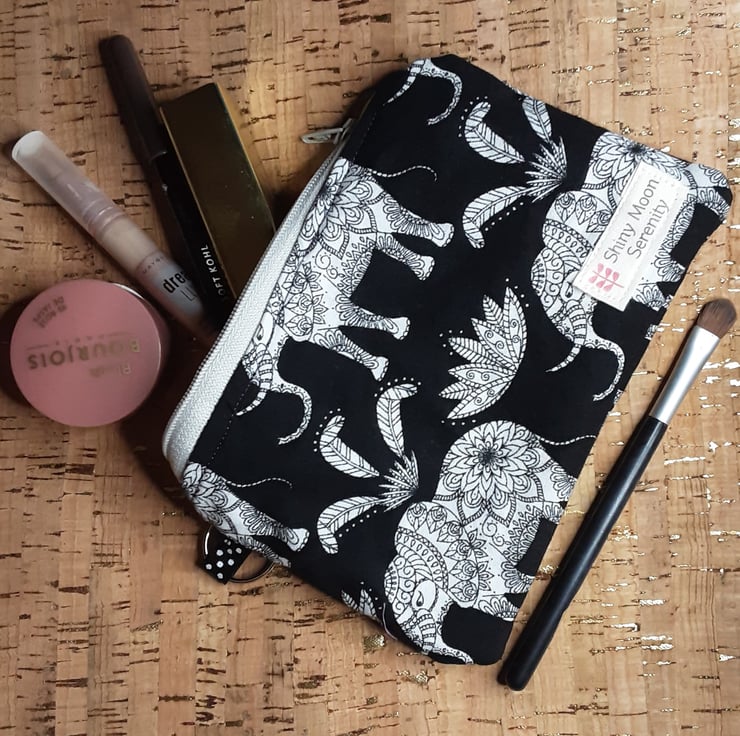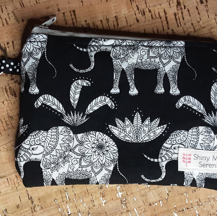 It is made from black cotton fabric with a white Elephant print on it. The lining is a plain cotton fabric in the colour orchid (pink).