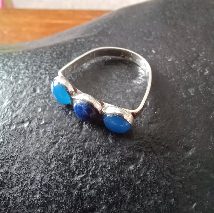 Elegant ring with three stones: one dark blue 6mm diameter lapis lazuli cabochon set between two royal blue 6mm diameter chalcedony cabochon stones. The ring base is handmade from sterling silver and holds a pattern..