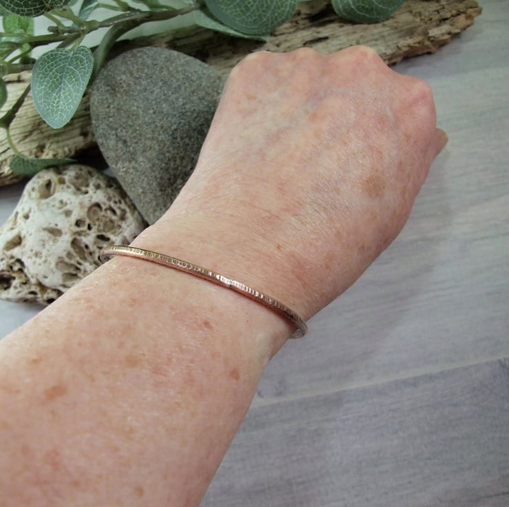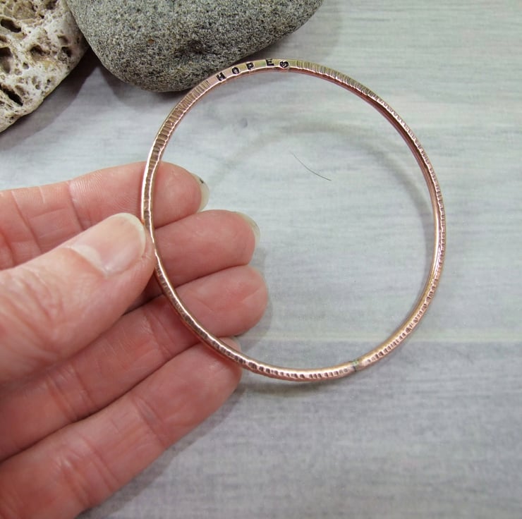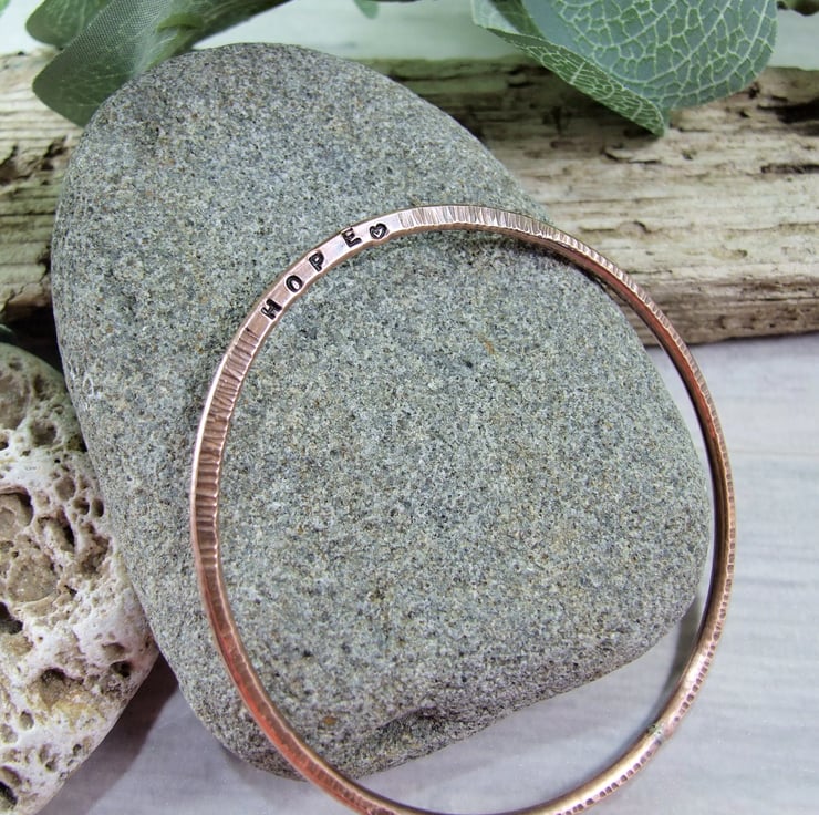 I have made the bangle from 2.6mm wide pure copper wire and slightly flattened on one side then stamped HOPE and a Heart in tiny 1.5mm letters. The bangle has a hammered antiqued oxidised finish.