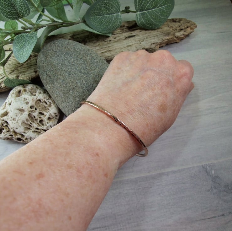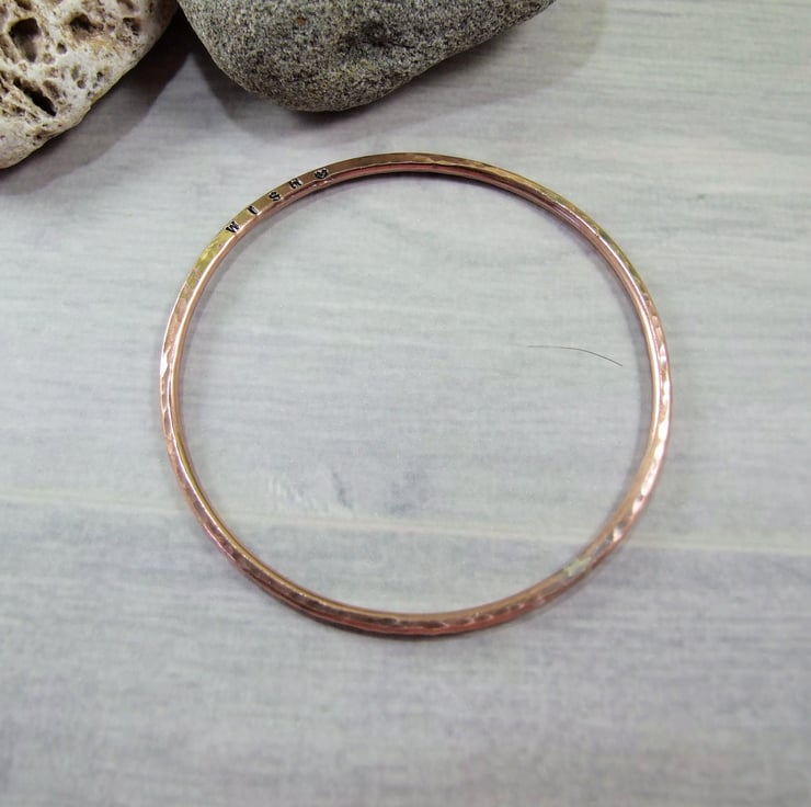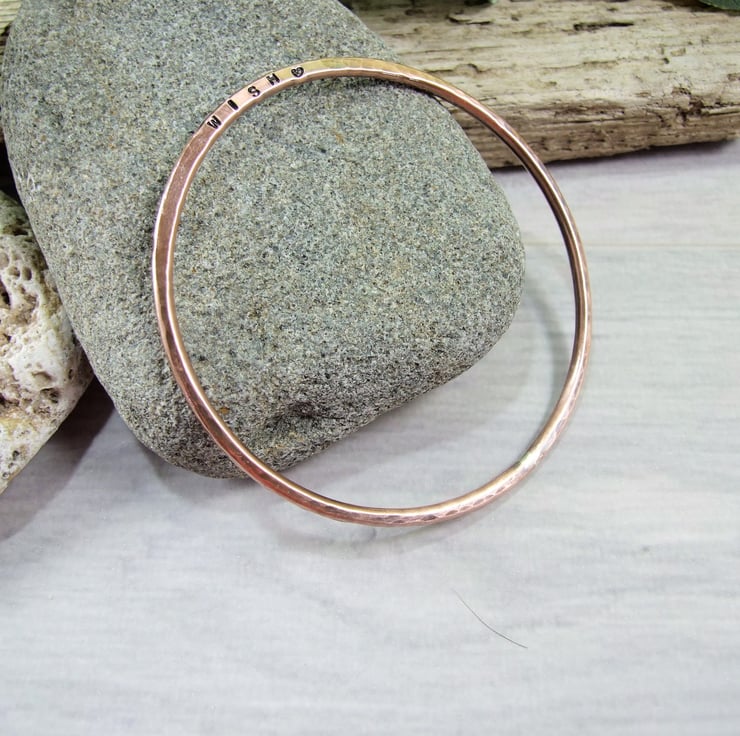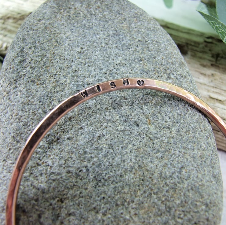I have made the bangle from 2.6mm wide pure copper wire and slightly flattened on one side then stamped WISH and a Heart in tiny 1.5mm letters. The bangle has a hammered antiqued oxidised finish.