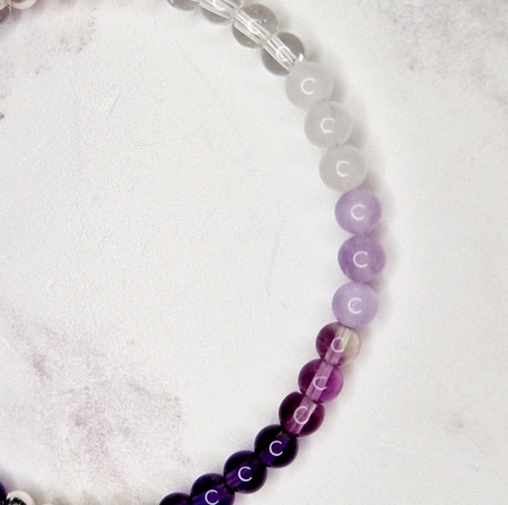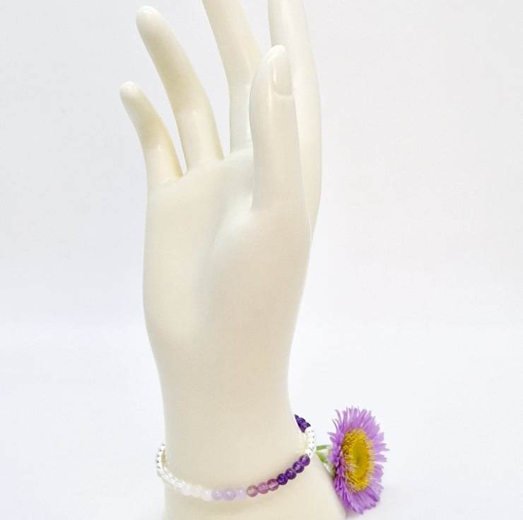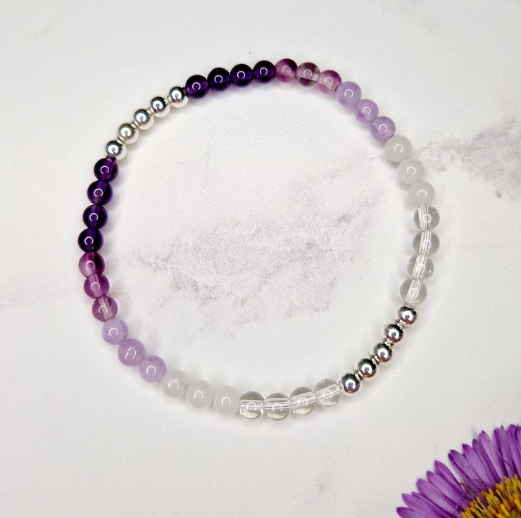 The bracelet is 18 cm and made of amethyst, fluorite, lavender and white jade with clear quartz beads, each are 4 mm and placed in an ombre gradient. These are combined with 4 mm round sterling silver beads that are placed between the two runs of colour.