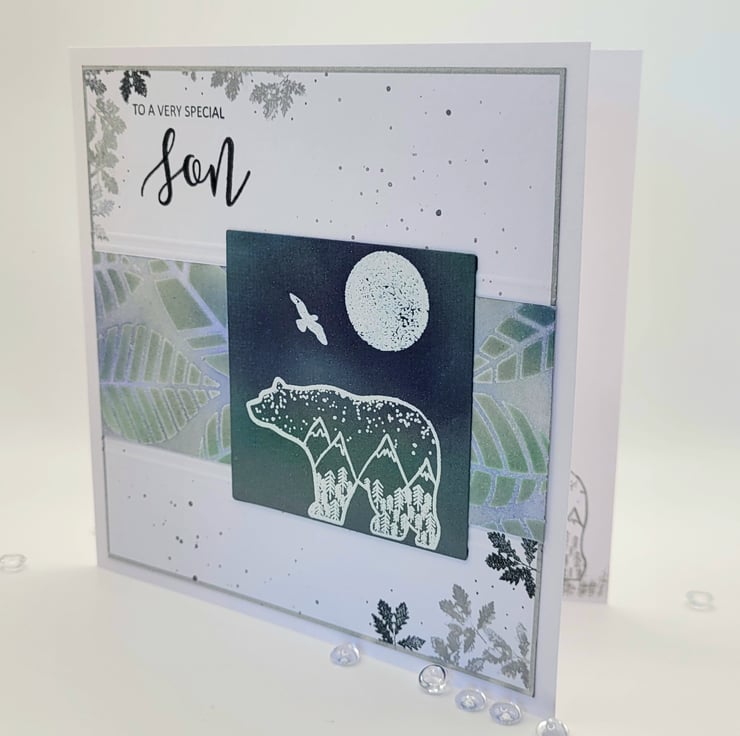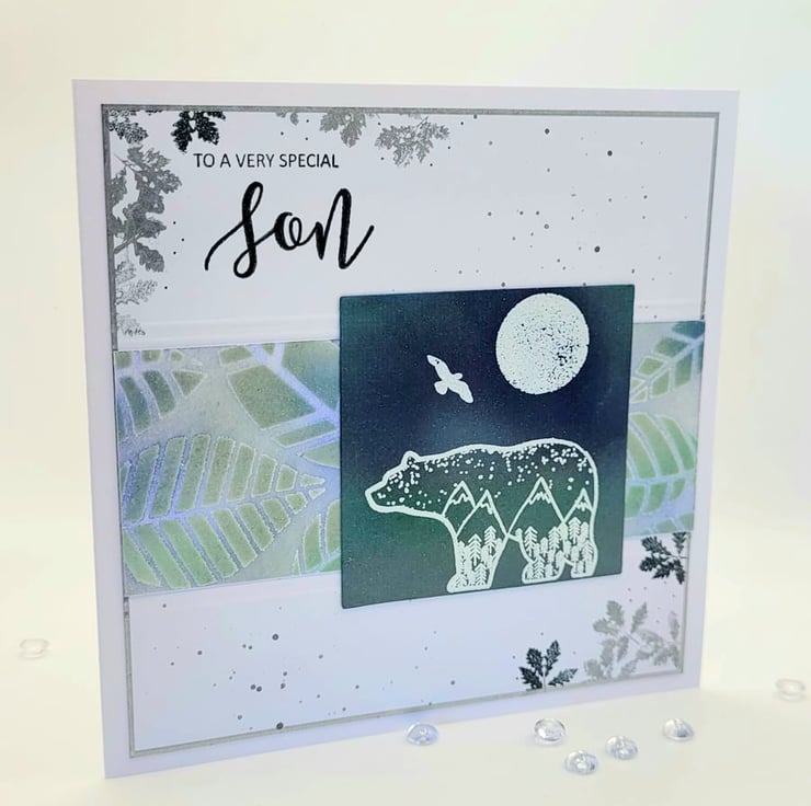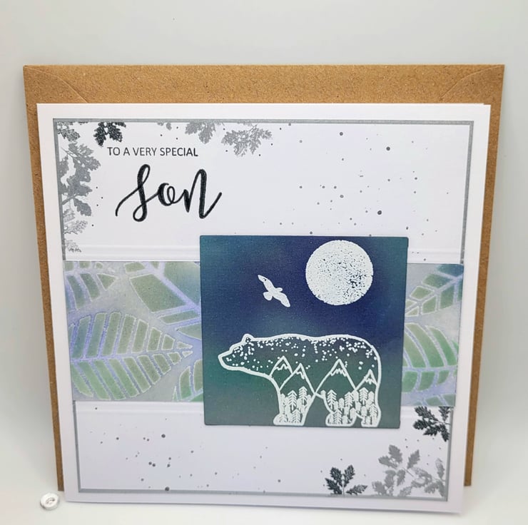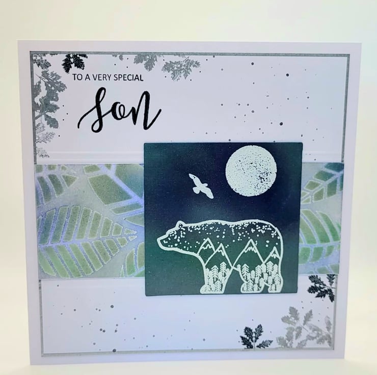 A layered and embossed handmade birthday card for a special Son. The card measures 14.5 x 14.5 cm and has an original design and embossed details incorporating foliage, a bear and fir trees, stars and a full moon and eagle. This individually handmade card has been stamped, heat embossed, stencilled and ink blended by hand and is truly unique.