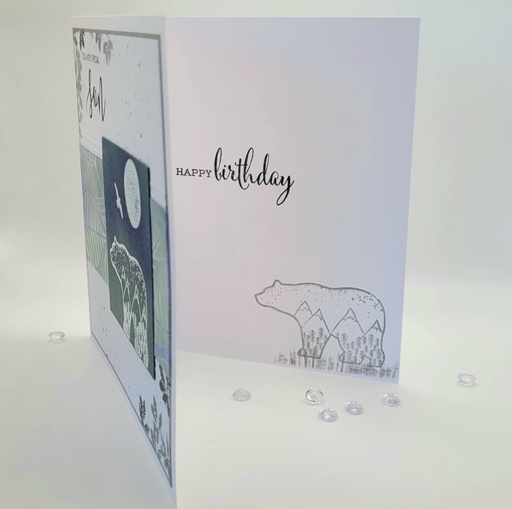 The message on the front reads TO A VERY SPECIAL SON and the inside has a simple HAPPY BIRTHDAY in mixed font. I stamped the bear in light grey ink in the bottom right inside corner to co-ordinate with the main design. Comes supplied with a 100% recycled brown kraft envelope.