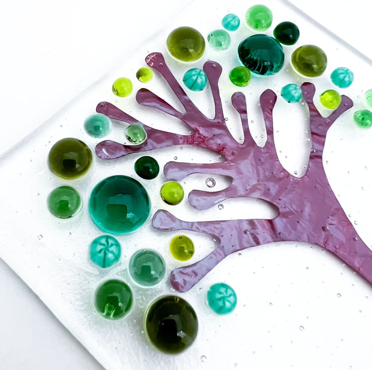 To make this suncatcher, I cut 2 rectangles from transparent art glass. Then I hand cut copper foil with a scalpel to make the trunk and branches of the tree and sandwich it between 2 layers of art glass. This is the fused slowly overnight in my kiln. In the heat of the kiln, the copper foil turns a lovely rich dark red colour. Once fully cooled, I then added coloured glass dots and leaves which I have made previously to give some added interest to the design. A second firing is done overnight the next day to tack fuse the dots onto the design, so that they stand proud of the glass, giving it a 3D effect. Once cooled again, I added the silver hanging wire.