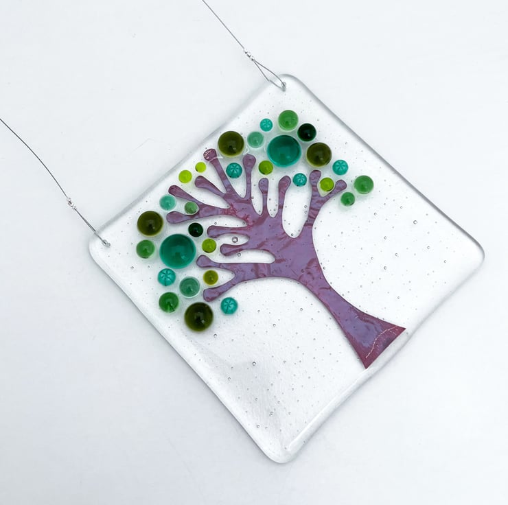 Fused glass hanging tree suncatcher featuring hand made green details. I've used fresh Spring green colours and is inspired by my love of nature and wildlife. A beautiful gift, perhaps for a relative, it looks lovely in a window, giving a splash of fresh colour.