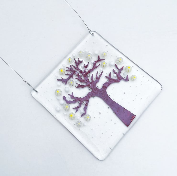 Fused glass hanging tree suncatcher featuring hand made white details. I've used fresh beautiful white glass and decorative white millefiori and is inspired by my love of nature and wildlife. A beautiful gift, perhaps for a relative, it looks lovely in a window, giving a splash of fresh colour.