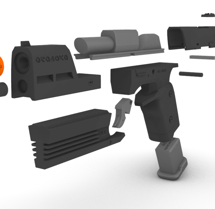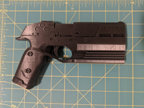 An unofficial 1:1 scale replica of Arasaka Tamayura pistol, from the Cyberpunk 2077 video game, complete with removable magazine.