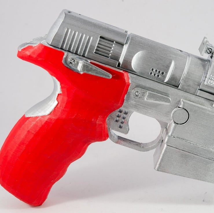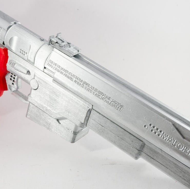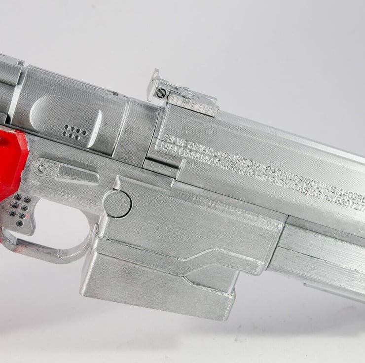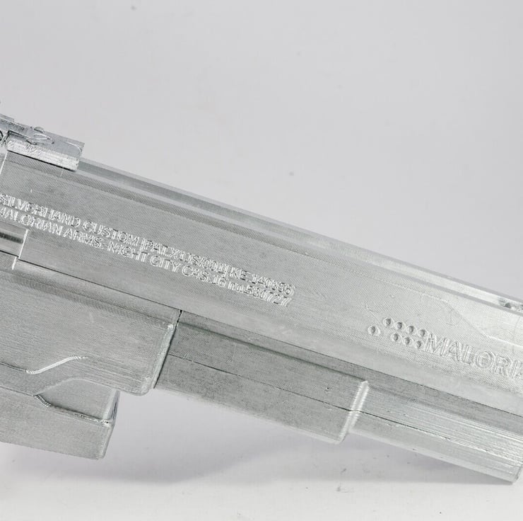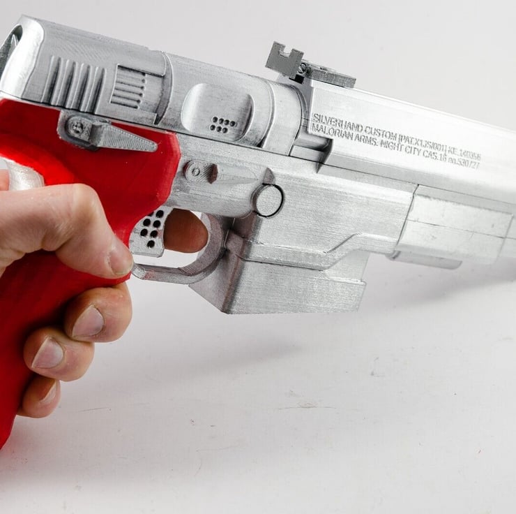 An unofficial 1:1 scale replica of Jonny Silverhand's Malorian Arms 3516 "Silverhand Custom" pistol, from the Cyberpunk 2077 video game.