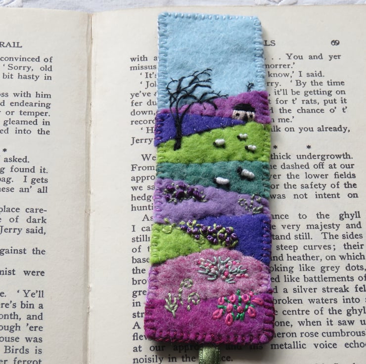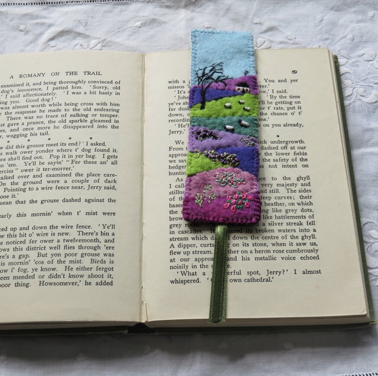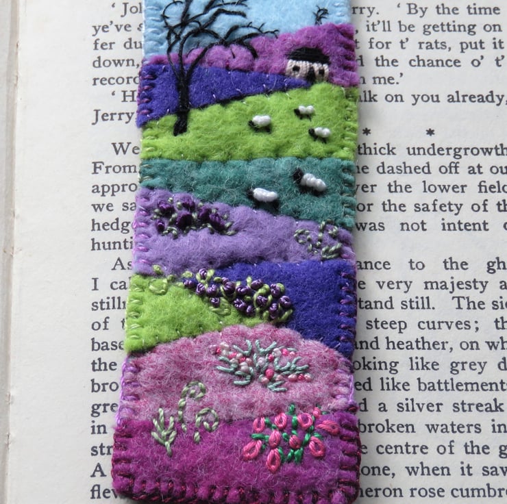 Heather clumps, a windswept tree, a little cottage and tiny sheep have been handstitched, in a selection of vintage threads onto this pretty bookmark. An easy-to-post gift for a book-loving friend.