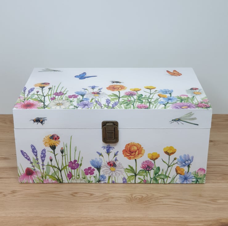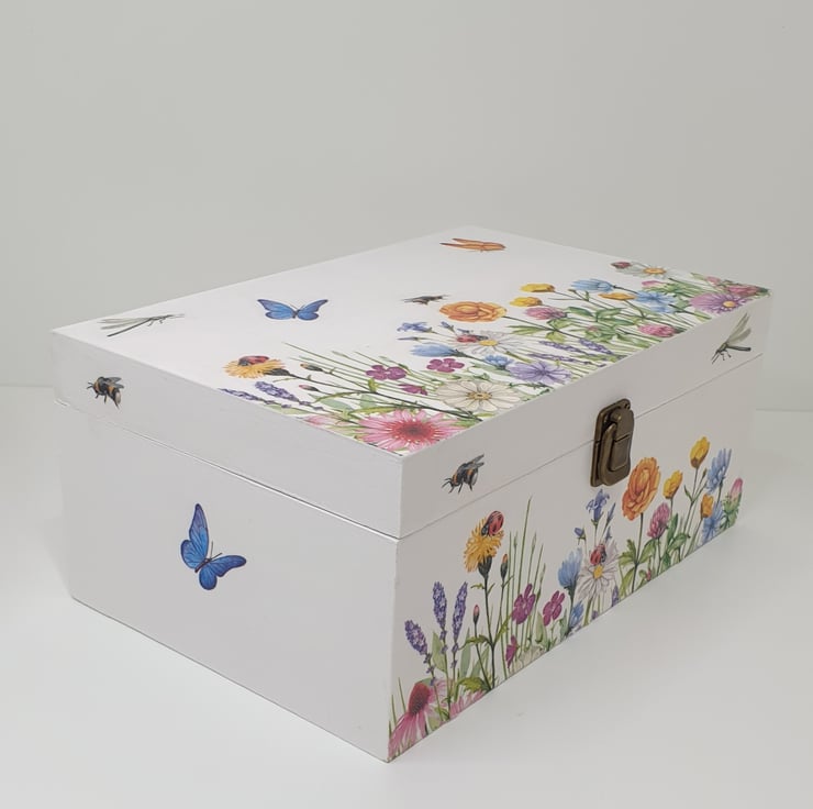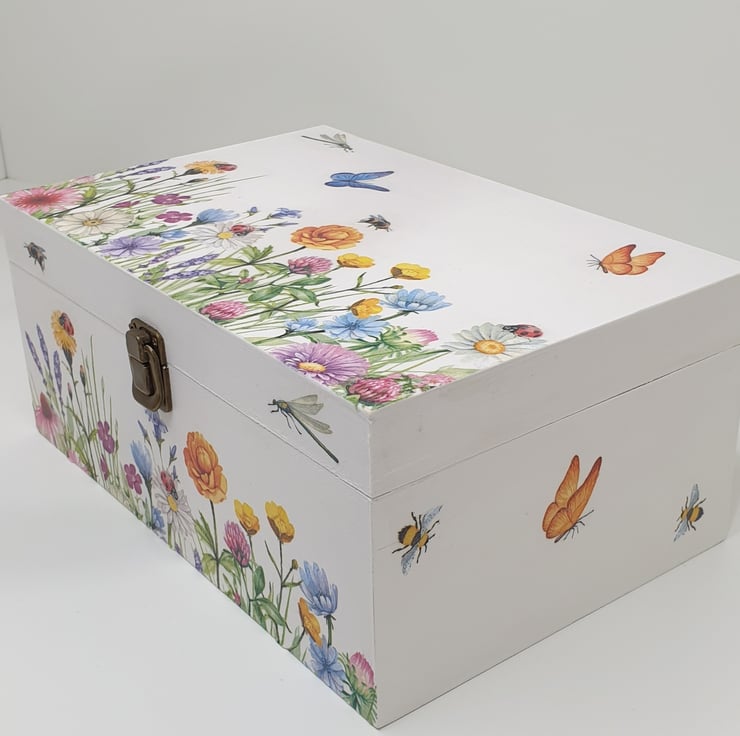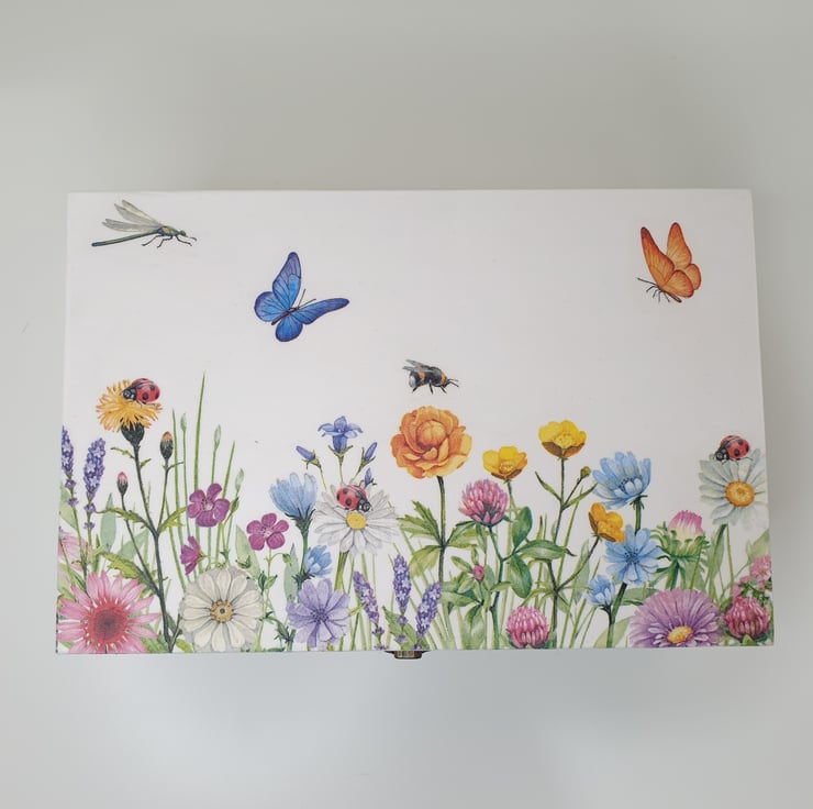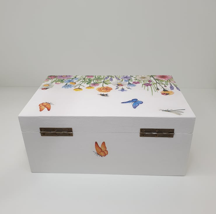 Very pretty wooden storage box which has been painted white and lovingly decoupaged with beautiful meadow flowers, butterflies, bees and dragonflies. The box has a secure metal clasp and the interior of the box has been painted white.