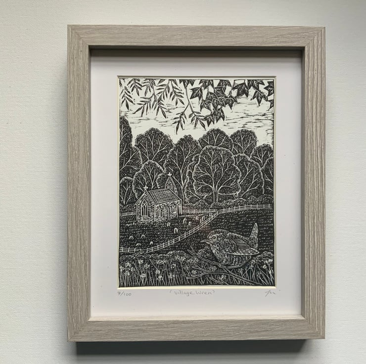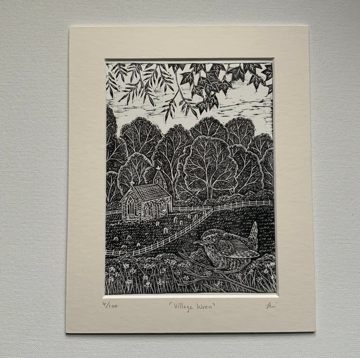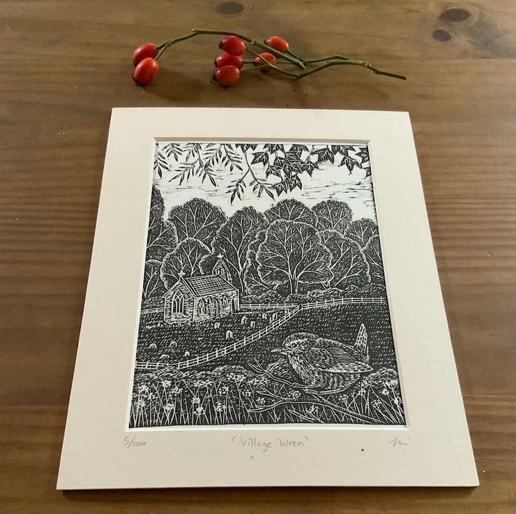 A limited edition original Linocut / lino print of a Wren, over looking a village church, entitled ‘Village Wren’.