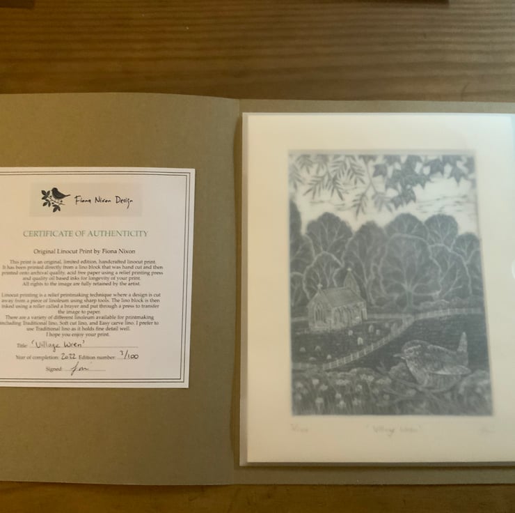 The Wren in this linocut print is pictured looking over the village church at Givendale in Yorkshire, a beautiful little village in the Yorkshire wolds countryside.