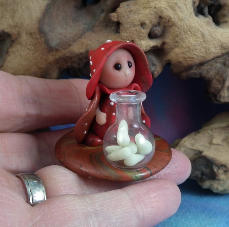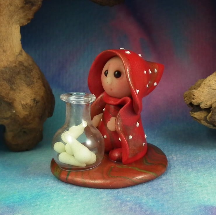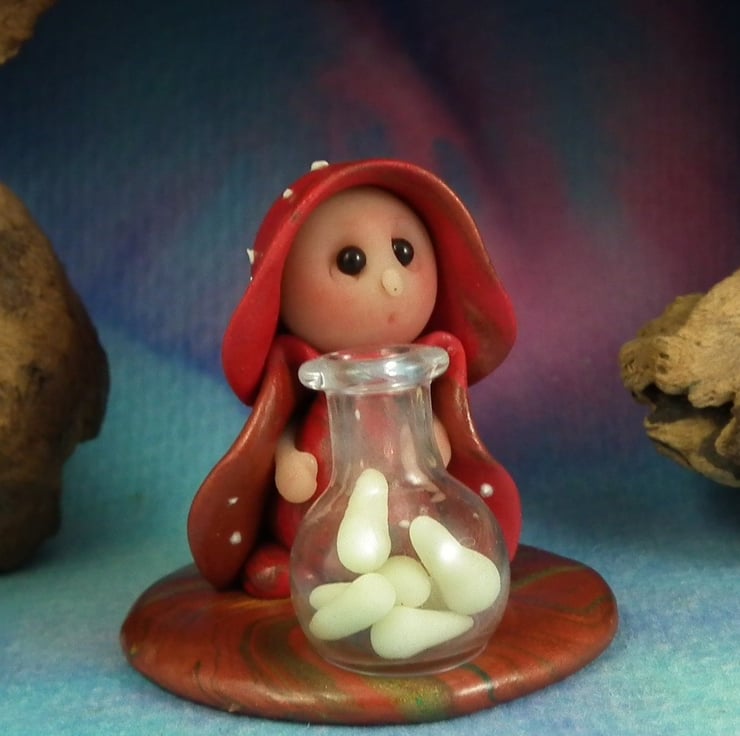 This is a 'one of a kind' creation having been entirely handmade without the use of moulds here at my studio on the Sussex Coast. Modelled with artist blend polymers, blushed before sealing with lacquer, Dilly has sparkling black onyx eyes and scarlet robes. Dilly the Garden Gnome is just one and a half inches tall. Dilly and the jar are both fixed in position on a modelled base