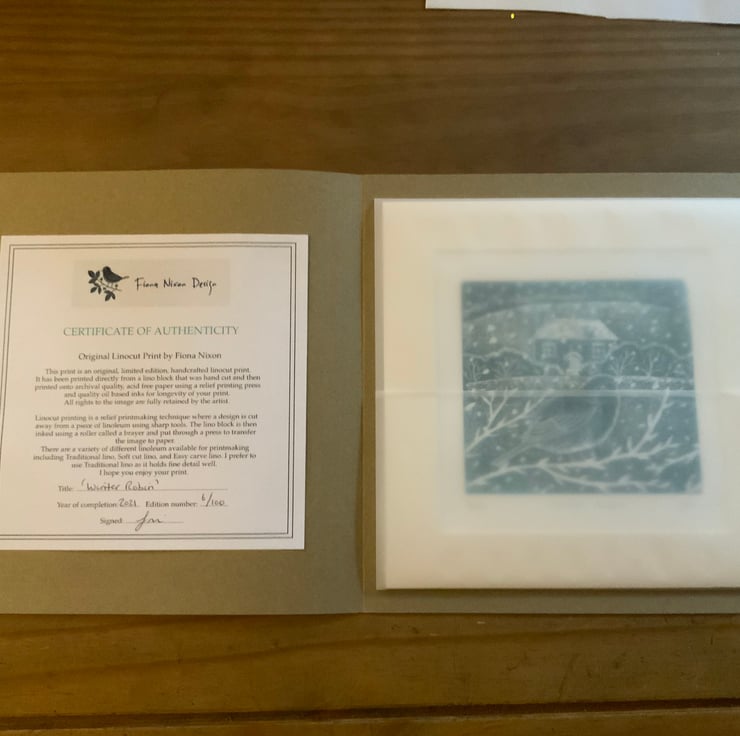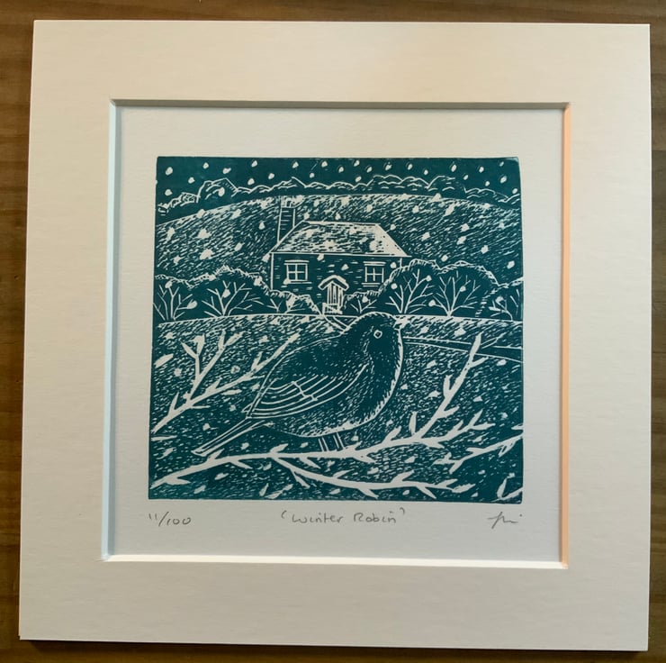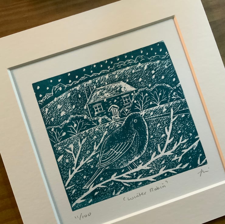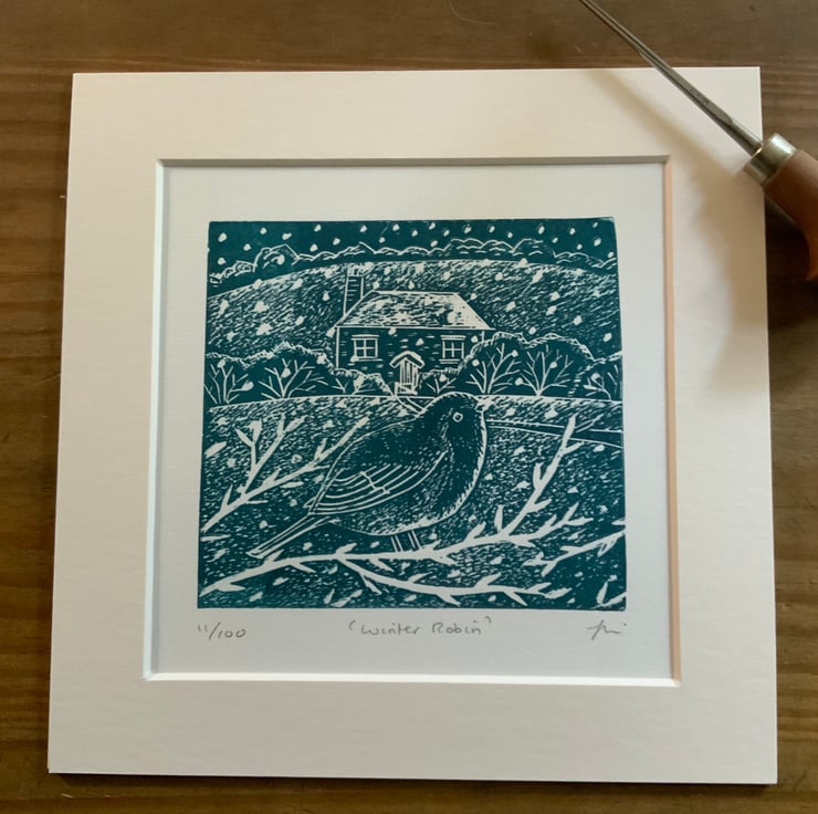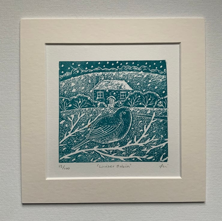 A limited edition original Linocut / lino print of a sweet Robin in winter.