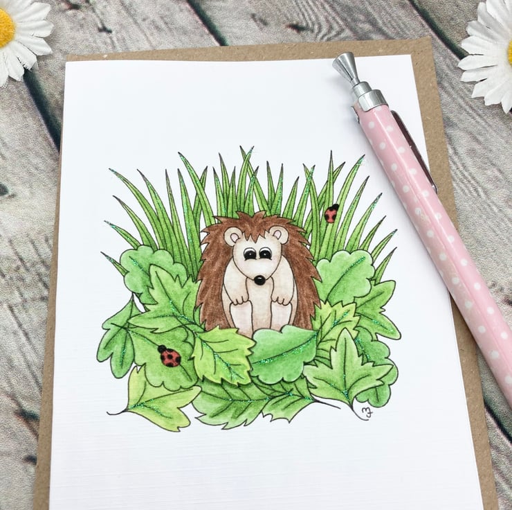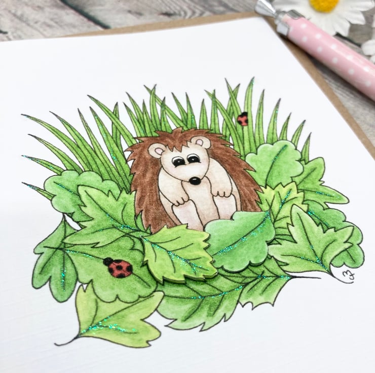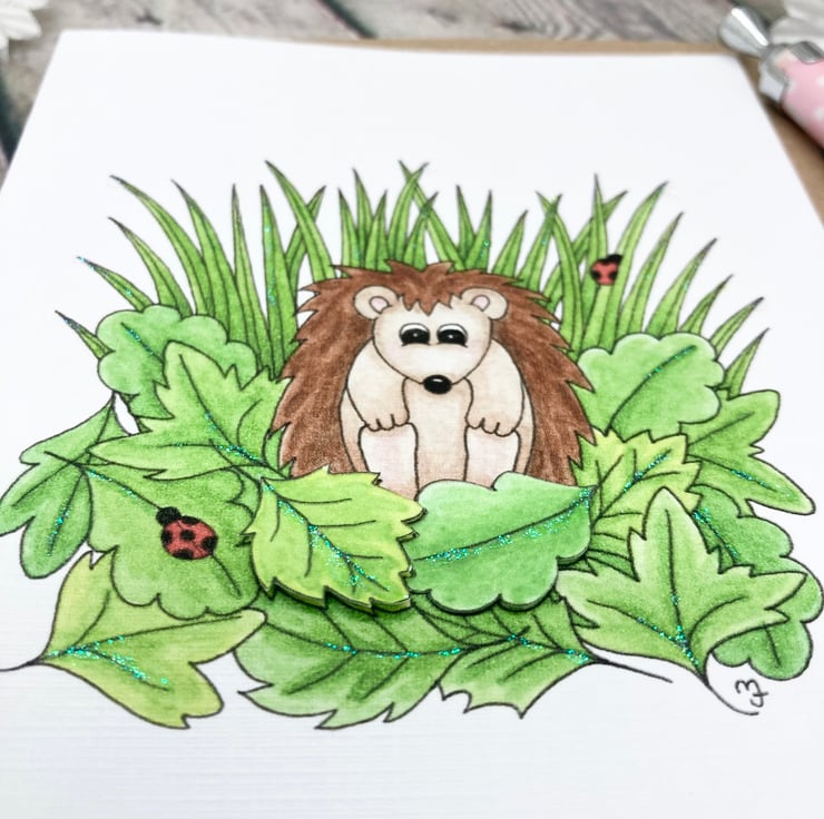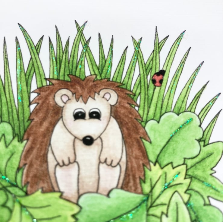 This cute hedgehog card has been designed using my own original illustration. The image has been printed out onto good quality white linen embossed card and decoupaged up in parts. I have also added a little glitter detail.