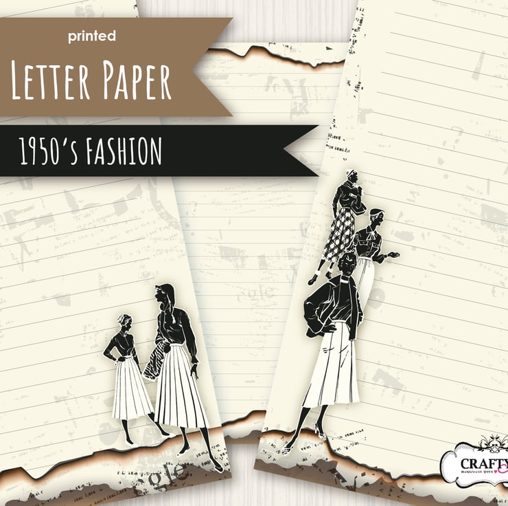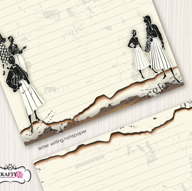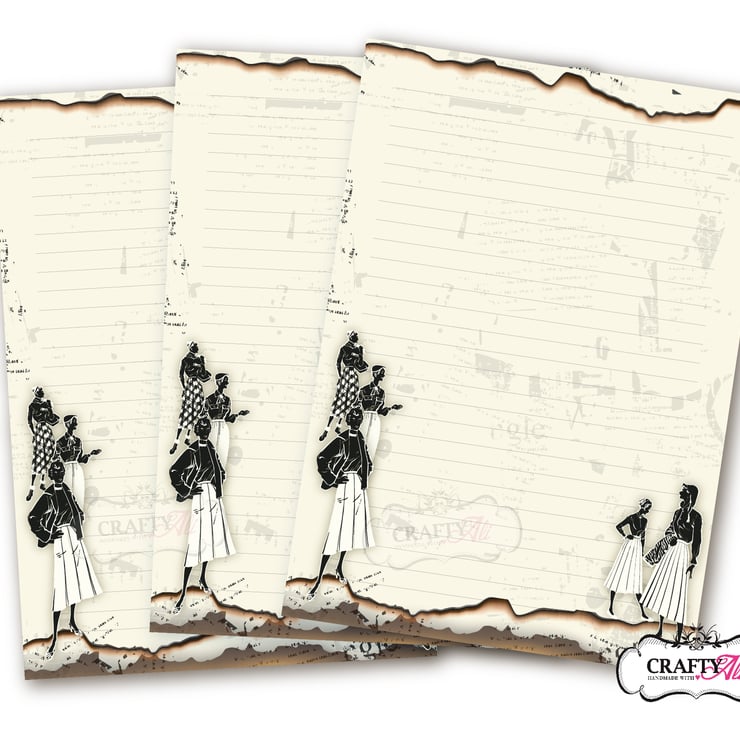 A set of 10 sheets of A5 size handmade letter writing / notepaper set with a distressed paper print background, burnt edge borders and featuring fashionable women, the images of which are taken from my original scans of 1950's newspaper adverts.