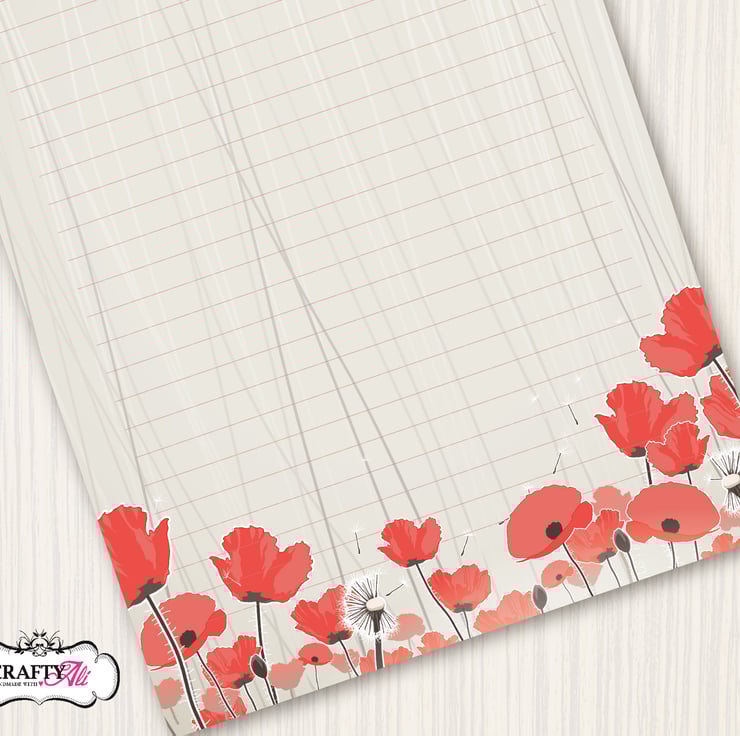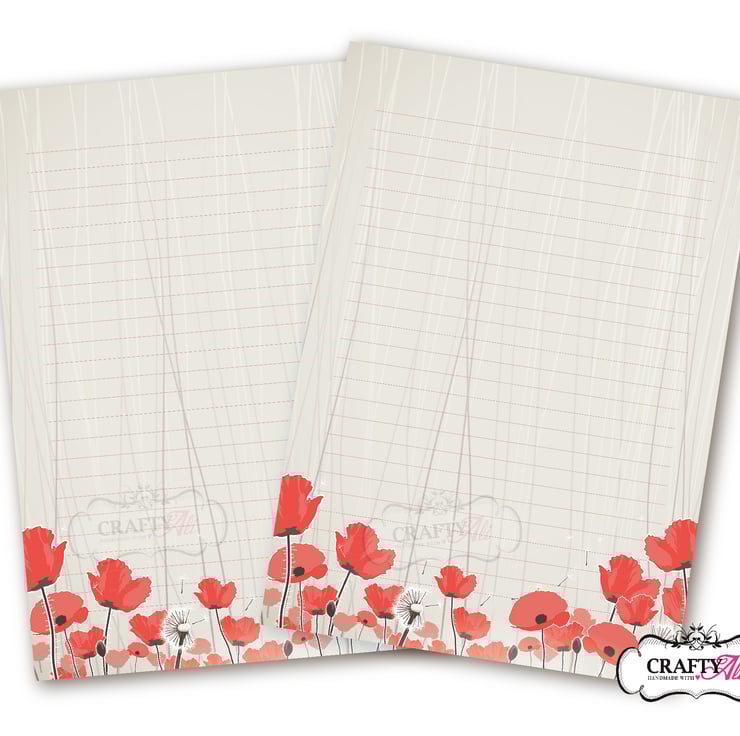 A set of 10 sheets of A5 size handmade letter writing / notepaper set with a pretty poppy design over a light background.