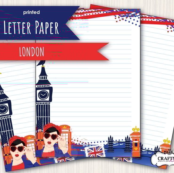 A set of 10 sheets of A5 size handmade letter writing / notepaper set with a cool London doodle theme, in vibrant red, white and blue.