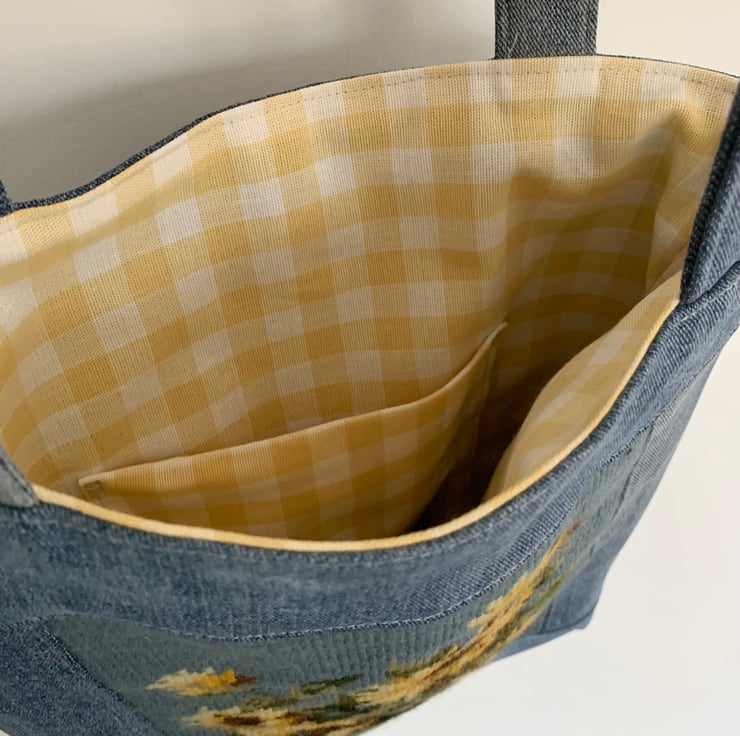 The wool tapestry has been framed with reclaimed denim from an old pair of jeans and the bag is lined with pale yellow gingham. A layer of interfacing gives the bag some structure.
