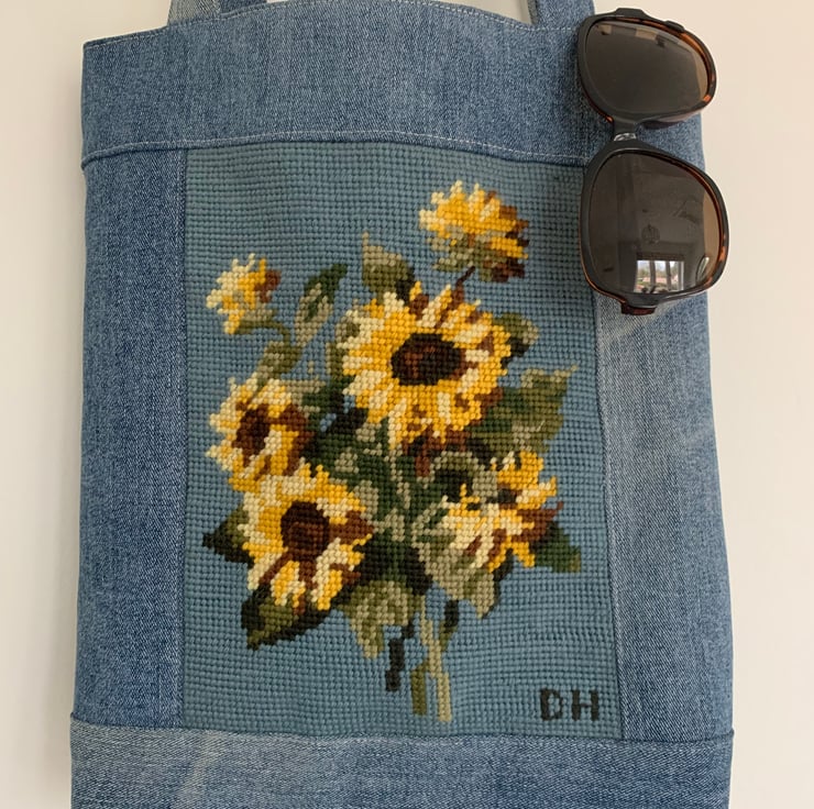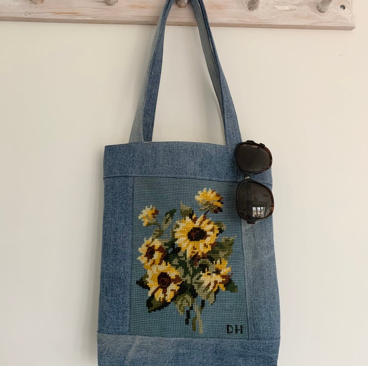 One of a kind small tote bag made from a pretty sunflower tapestry panel in soft shades of blue and yellow combined with denim from old jeans.