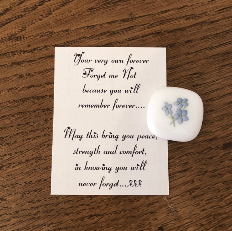 Each Forget me Not glass pebble (one supplied) comes with the message printed on high quality Conqueror textured paper. It comes in a 5cm x 5cm white textured box with the message in a white heart bound envelope.