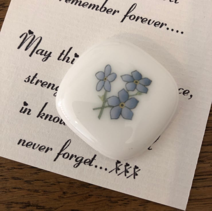 Our little Forget me Nots have been individually fused into glass, when this process is carried out the flower will go wherever the glass allows, so each one will be slightly different, some round and some slightly square, leaving a beautiful smooth glass pebble.