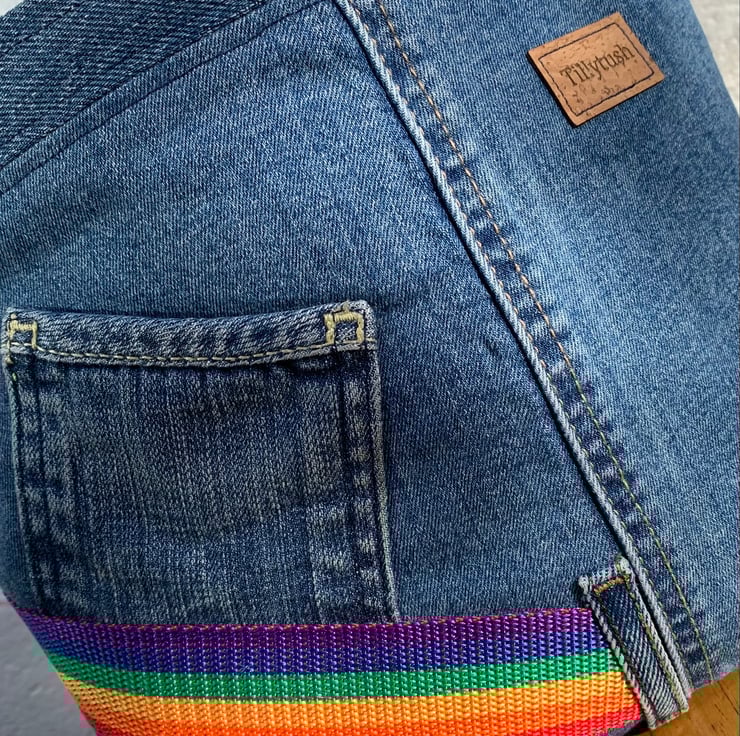 A great little crossbody/shoulder bag in recycled denim with rainbow detail.