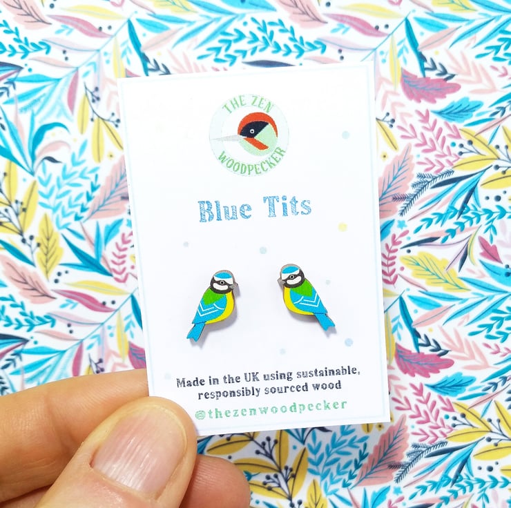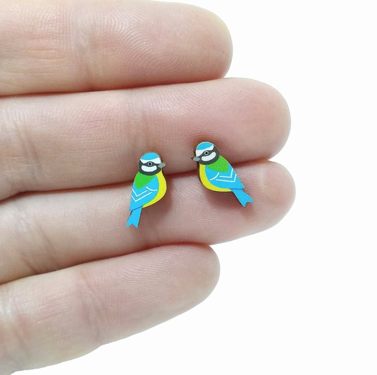 Laser cut wooden blue tit stud earrings designed by me and made in the UK using birch plywood from sustainable, responsibly managed woodlands.