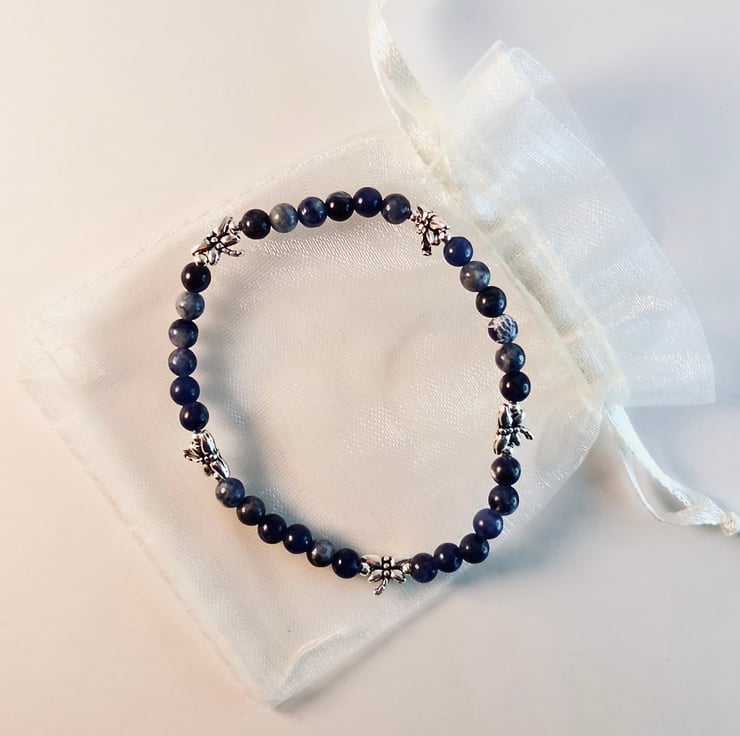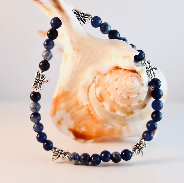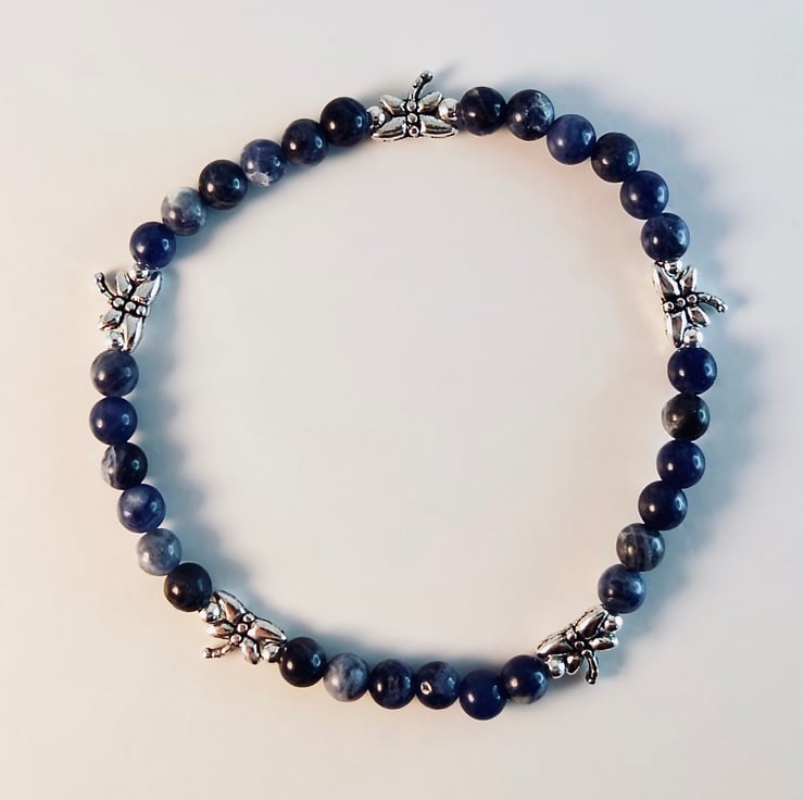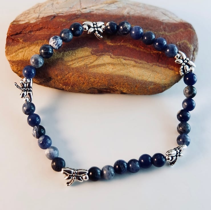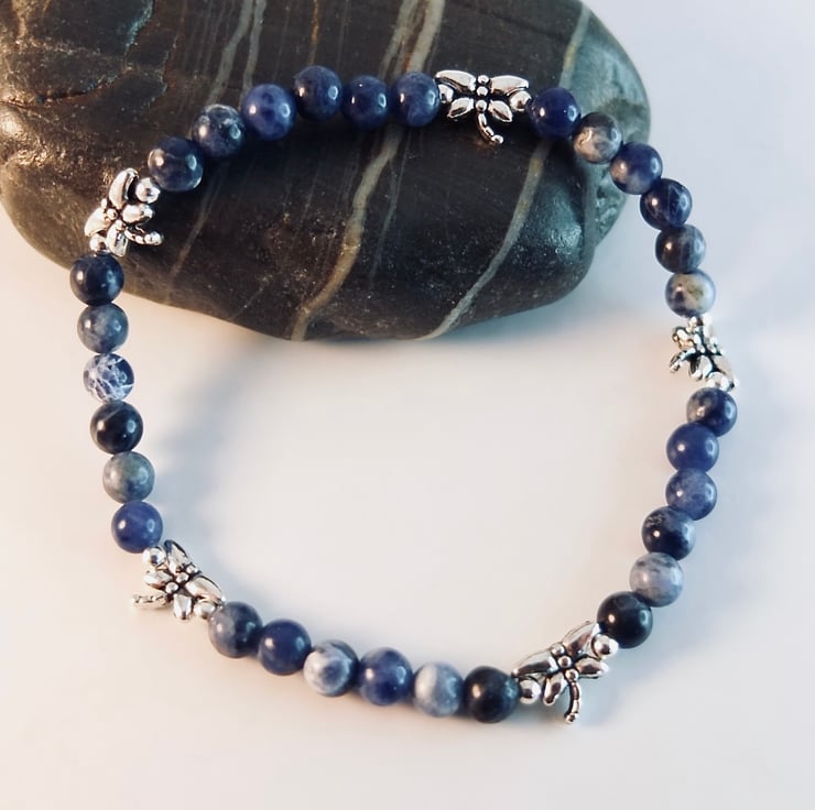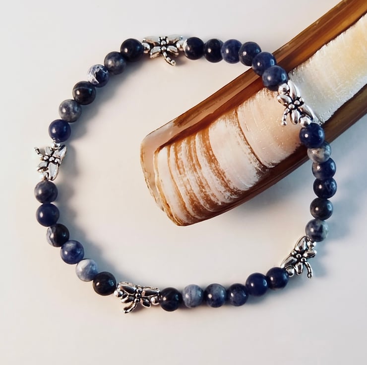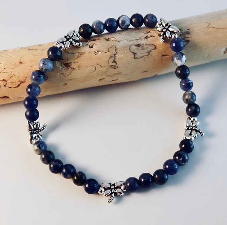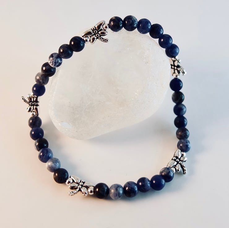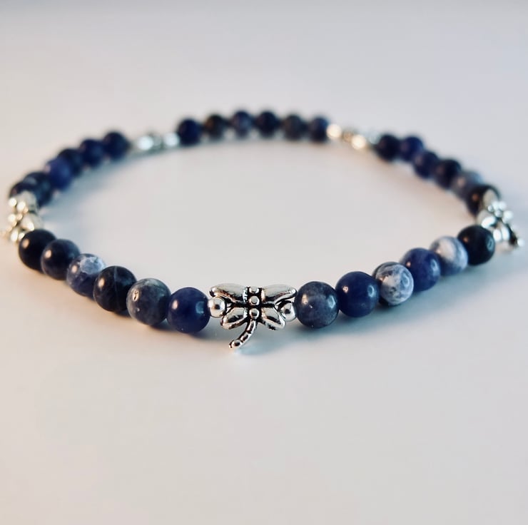 Dainty stretch bracelet made from 4mm sodalite set with five antique silver 6x8mm dragonfly beads.