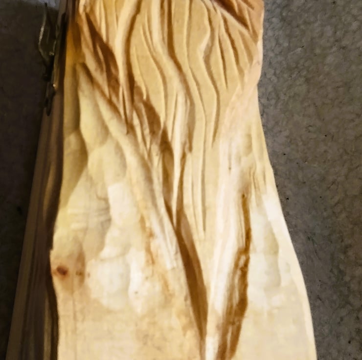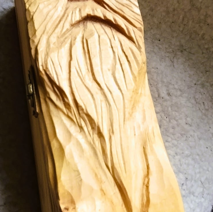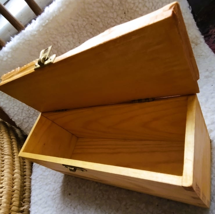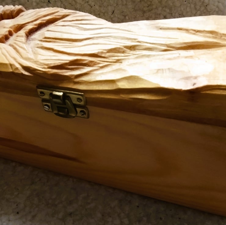 a box I made from pine with a lime lid that I carved. (Note the hinges slide into slots and need gentle handling otherwise they will break)