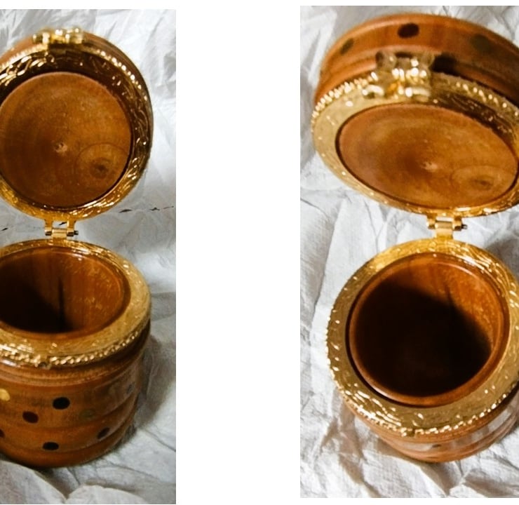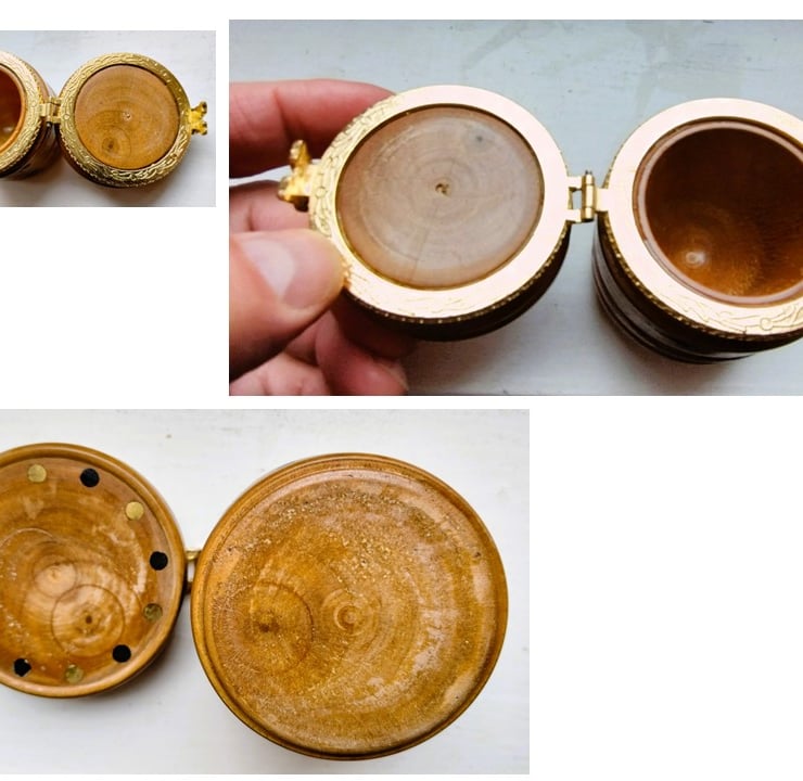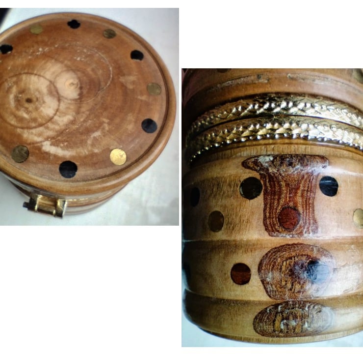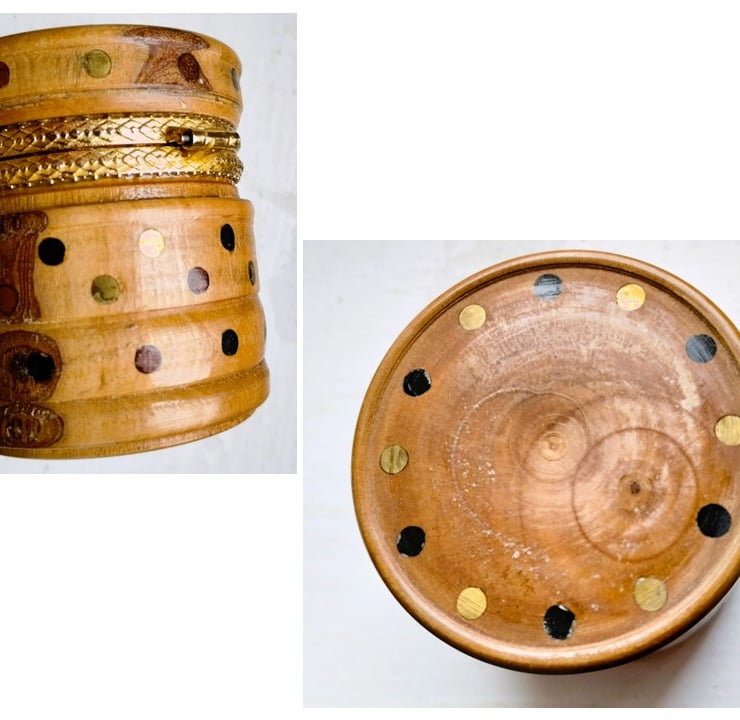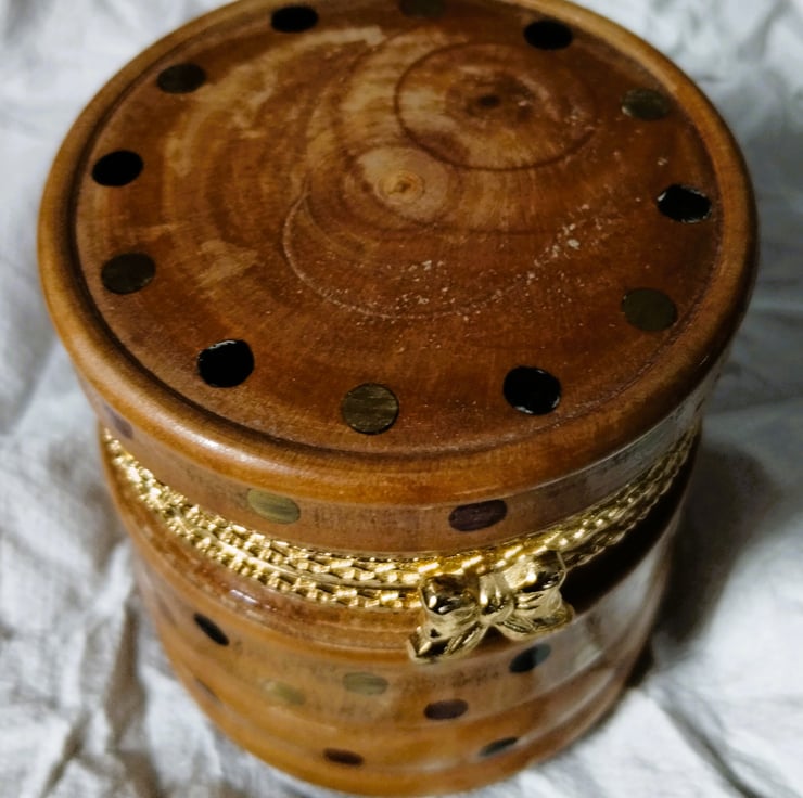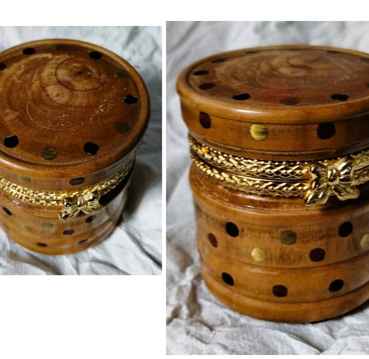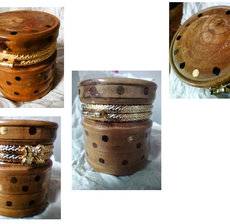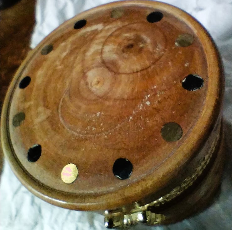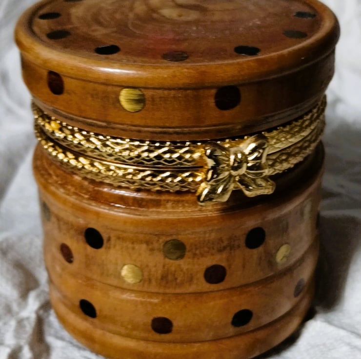 a small box I made years ago from a piece of cherry from a tree I cut down at my in laws house. 65mm tall x 58 mm diameter, it has small dots made from ebony, brass and mahogany and a brass style hinge that allows the lid to open. My daughter used it for years and now she has moved out and left it behind I am offering it to a new owner. The box isn't perfect, was has been caught in the wood grain and the grain has left marks, some of the dots have sanding scratches...but it is what it is, a lovely piece for storing little knick nacks and looking rather good:- even if I do say so myself...next time I make one I will take more care with the finishing, which I have learnt more about over the years...