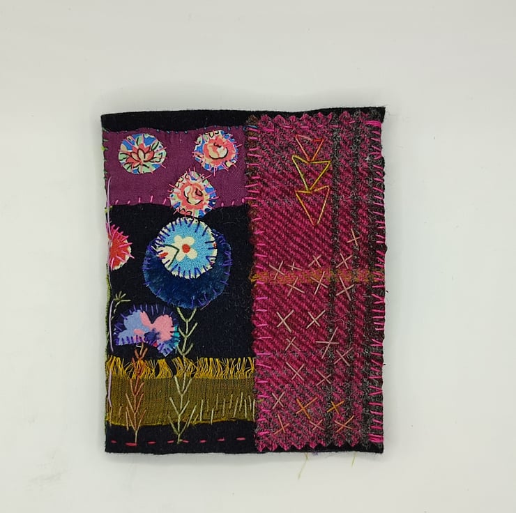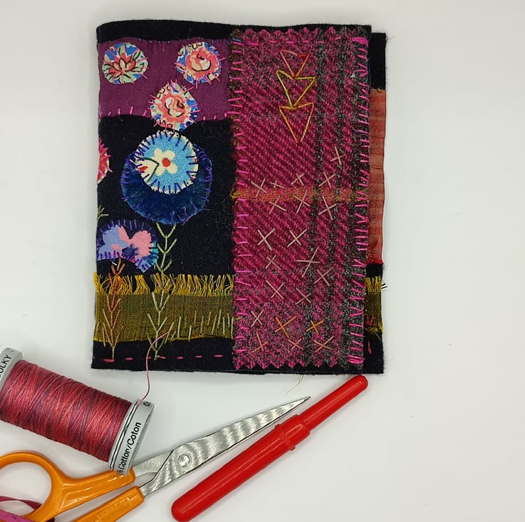 Hand stitched needle case. A beautiful, individual needle case. Made with pure wool fabric decided with applique flowers cut from printed cotton.