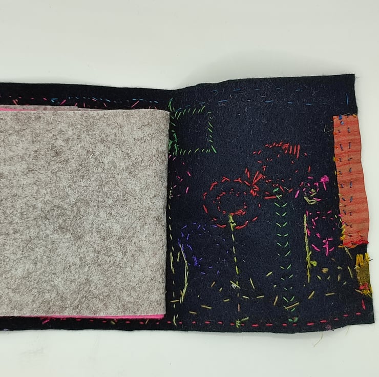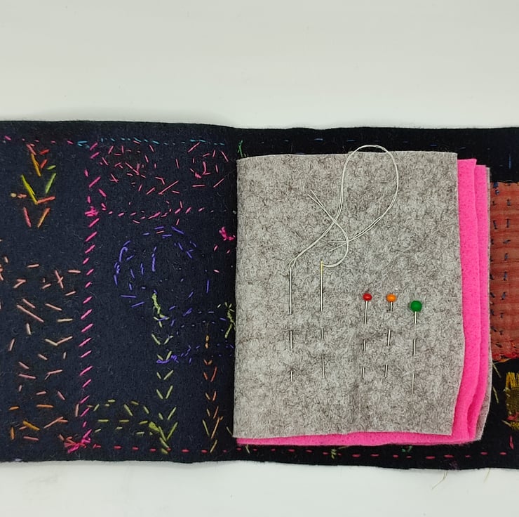 Inside are 4 felt pages to store needles, pins and safety pins. The pages are hand stitched in place.