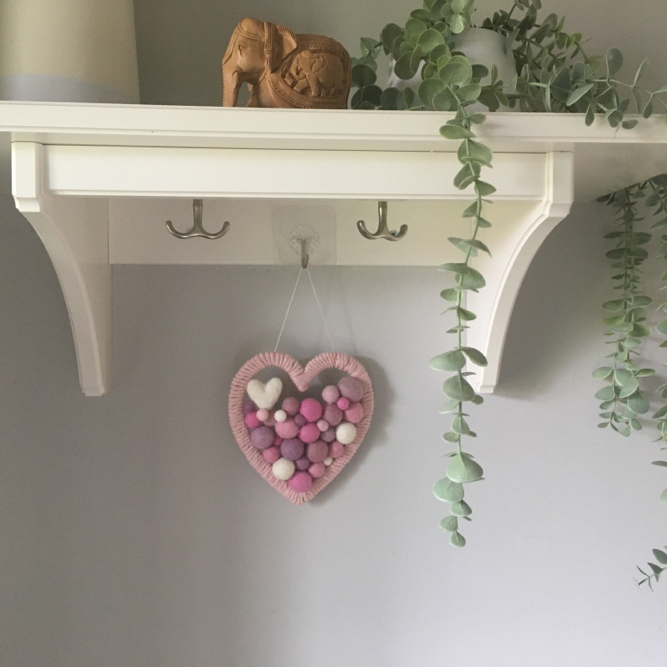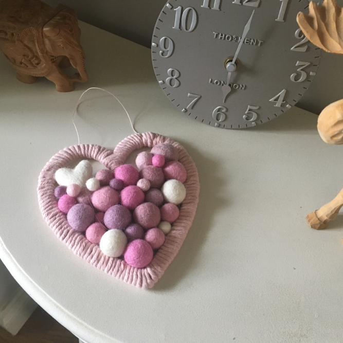 In shades of pink, lilac and white, each felt ball is handmade from 100% wool and arranged inside a macrame wrapped wooden heart. The pink macrame threat used to wrap the heart is 100% recycled Bobbiny cotton which is beautifully soft .