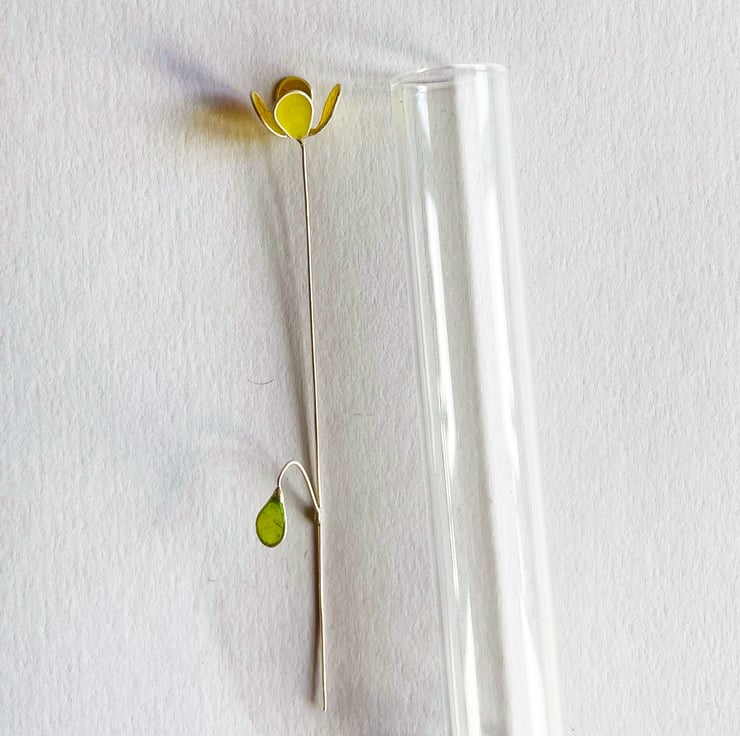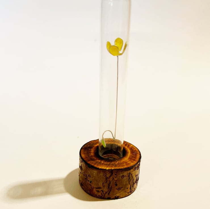 The flower is handmade using fine silver wire, coloured with resin and trapped in a glass test tube, the base of the display is hand carved hazel wood.