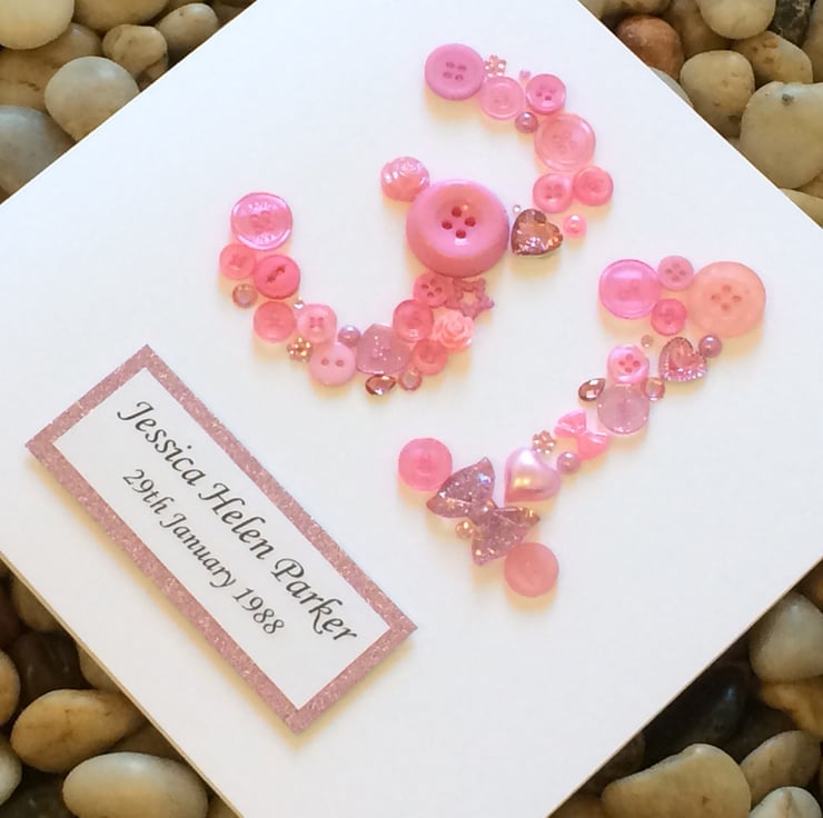 The age is carefully formed using pink and purple buttons and embellishments. The quality white card size is 8”x8” and comes with an envelope.