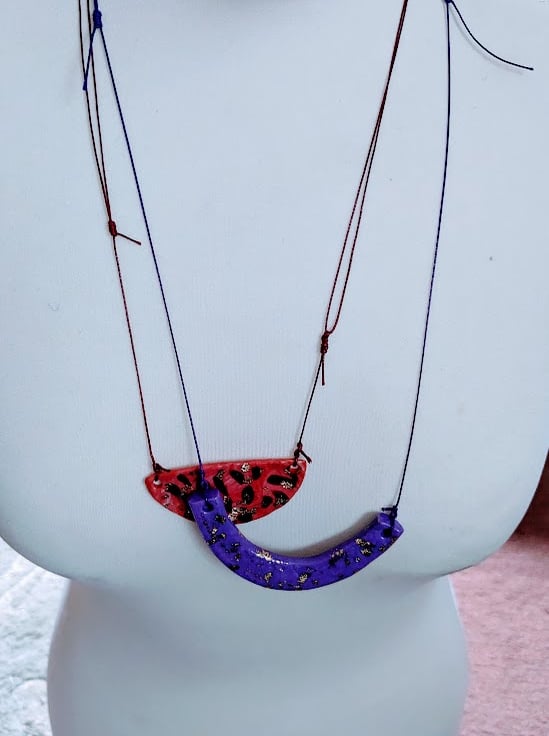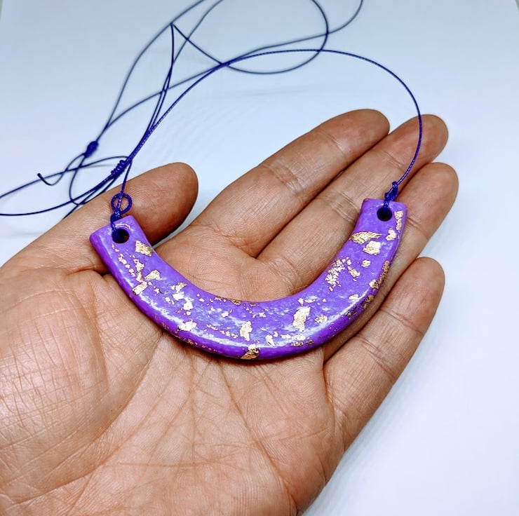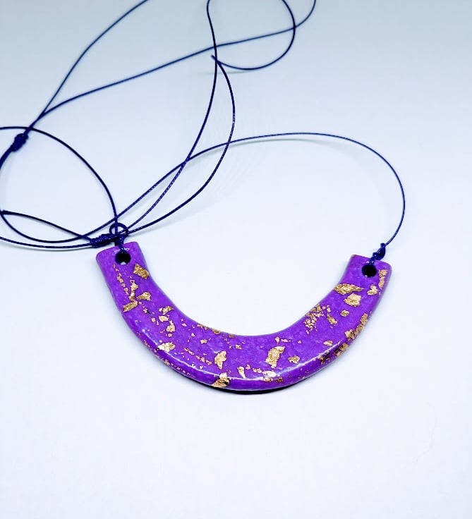Add some colour to your outfit with this fun polymer clay necklace with gold leaf.