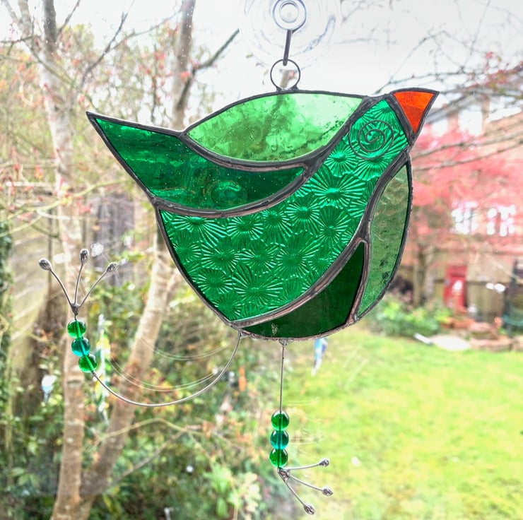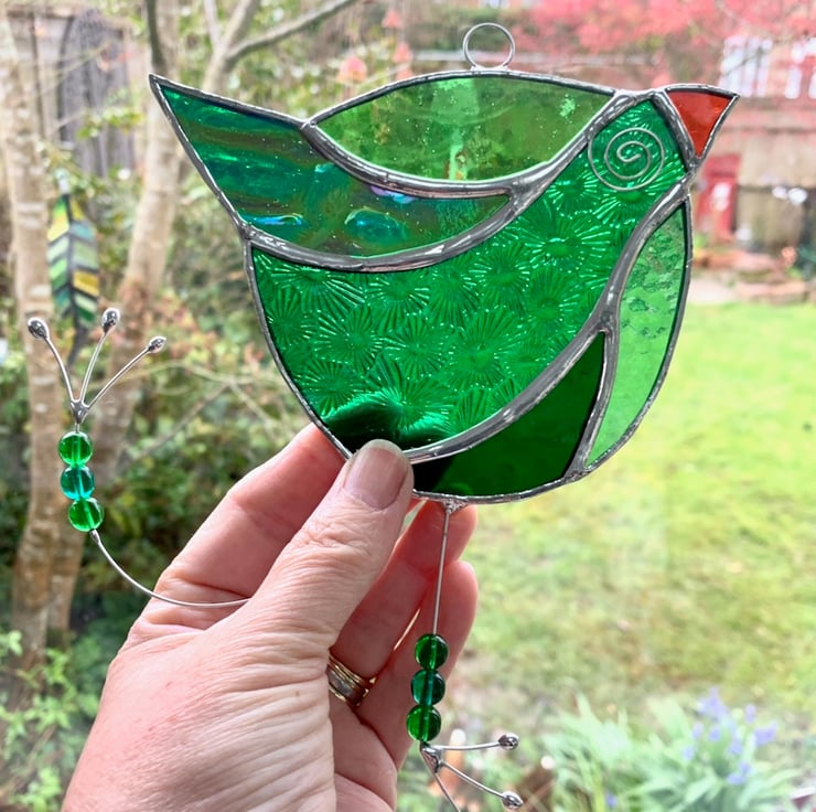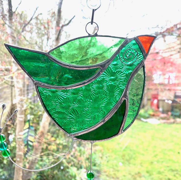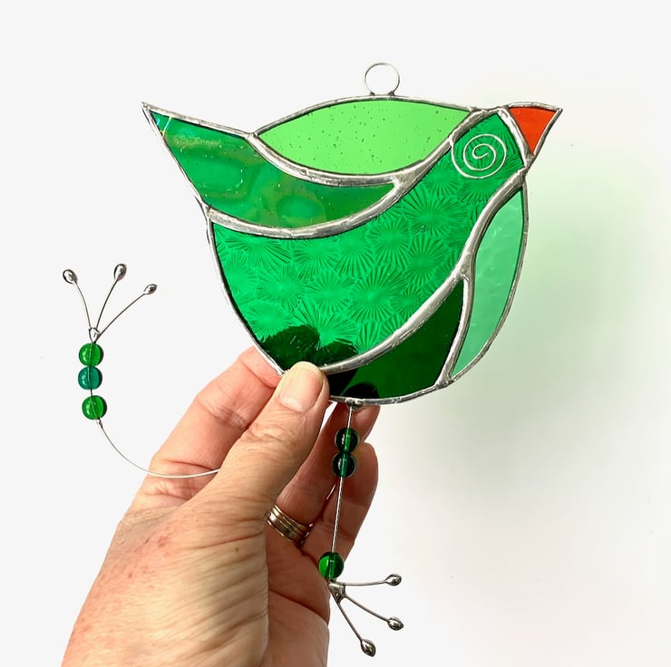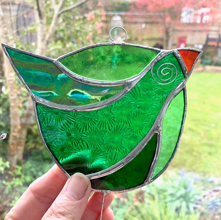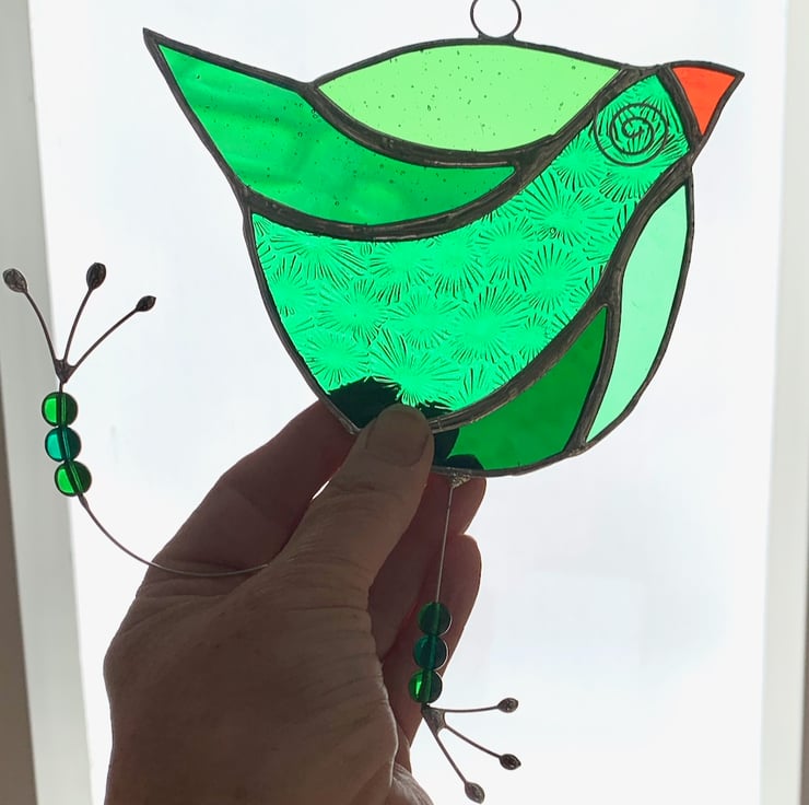 This has been made using different types of green stained glass for the body and orange glass for the beak.