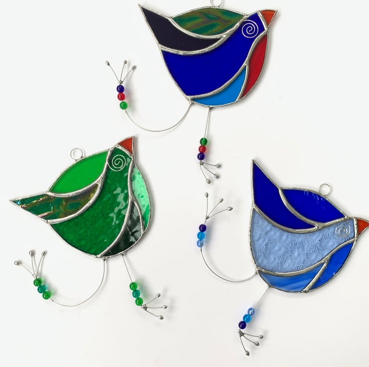 Each piece of glass has been hand cut, ground, washed, foiled and soldered together then washed again and polished. The eye, legs and feet have been made from tinned wire and glass bead threaded on.