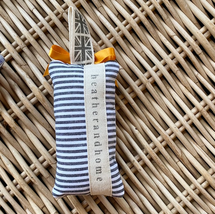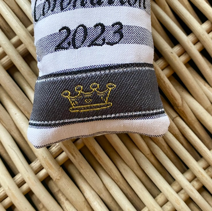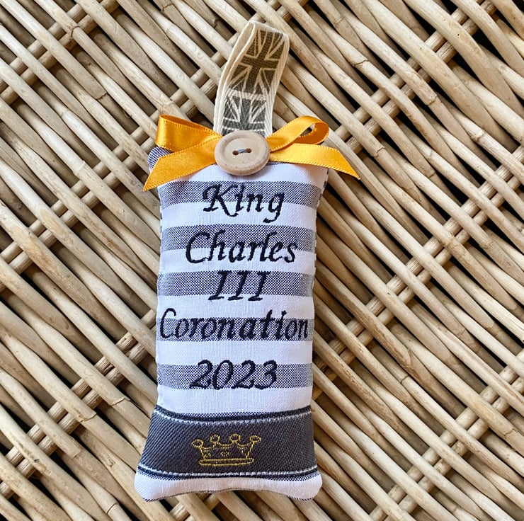 In grey and white striped cotton, embroidered in black with the words, 'King Charles III Coronation 2023' and with a grey ribbon below depicting a regal golden crown. Filled with super scented locally grown Hampshire lavender. The reverse side is in narrow grey and white stripes and has a 'heatherandhome' ribbon label. Finished with a Union Jack hanging loop, a round wooden button and a golden satin ribbon bow.