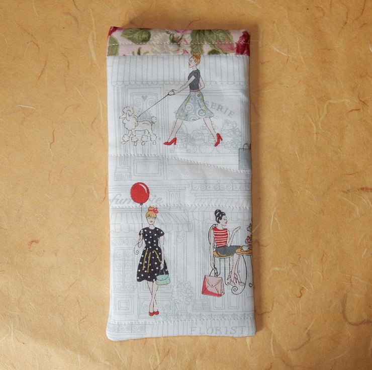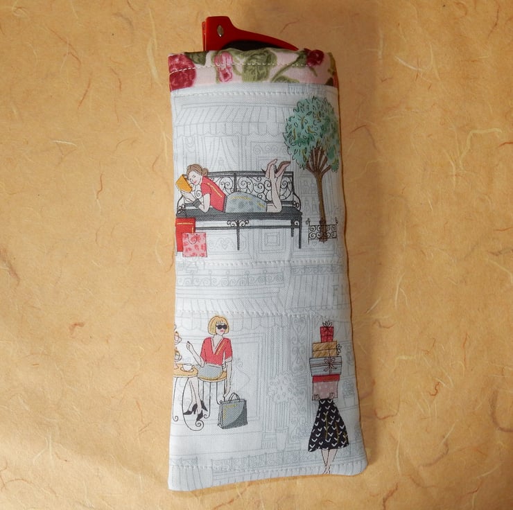 Chic Parisian ladies go about their business, walking a poodle and visiting the shops on this elegant glasses case which is made from a cotton fabric with a pink floral print trim and lining. This is a slip in style glasses case, if you require a case which fastens please view my other listings.