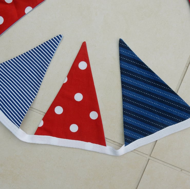 Red, white and blue in a combination of spots, stars and stripes is a classic. This bunting would be suitable for the coronation or for many occasions. It is made from cotton fabric in shades of red, white and blue. The white tape measures 2.5 metres total, with the measurement from first to last flag being approx. 1m 67 (65 inches). This gives a generous length of bunting, with ties at each end for hanging. Each of the 12 flags is 16cm (6.5 inches) deep.