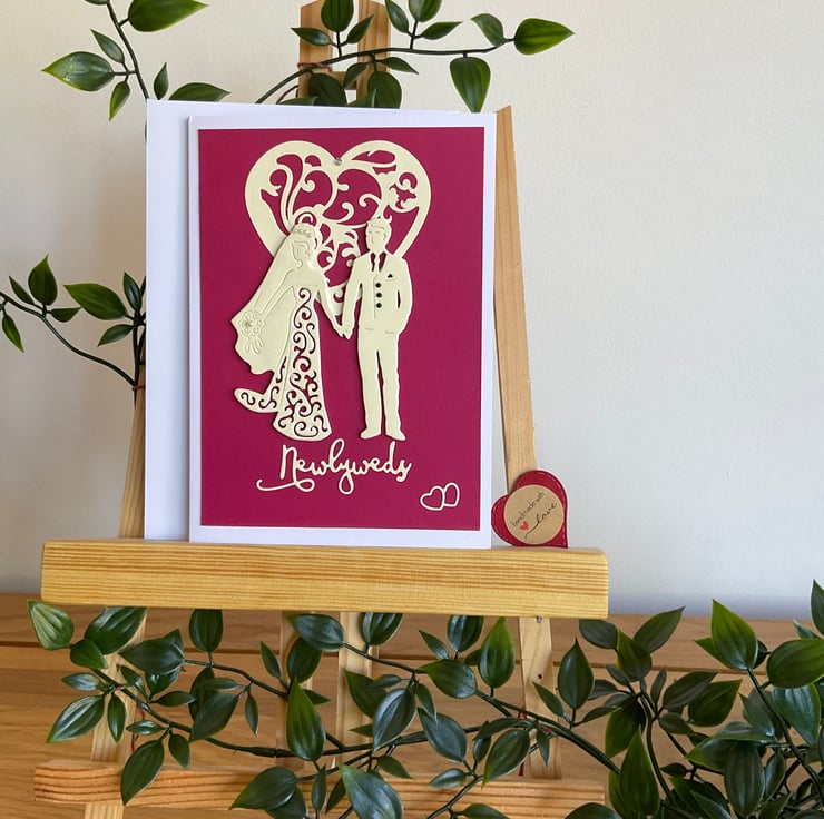 This deep red card is decorated with a die cut heart and a bride and groom which is raised on a foam base. The card is finished with the word newlyweds and is decorated with faux pearls. The card measures 18 x 12 cms and has the wording ‘Sending congratulations on your wedding day and wishing you the joys of a wonderful life together’ printed on the inside. It comes with a white envelope.