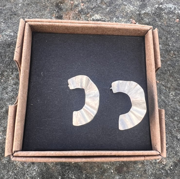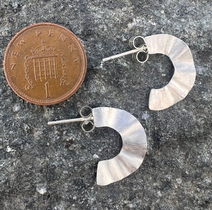 Simple silver circular stud earrings; a twist on a hoop earring . I have cut the circular shaped from flat silver sheet and given them a wavy surface , inspired by lichen. The diameter is 20mm/ 0.75 inches, which is the length of the earrings .