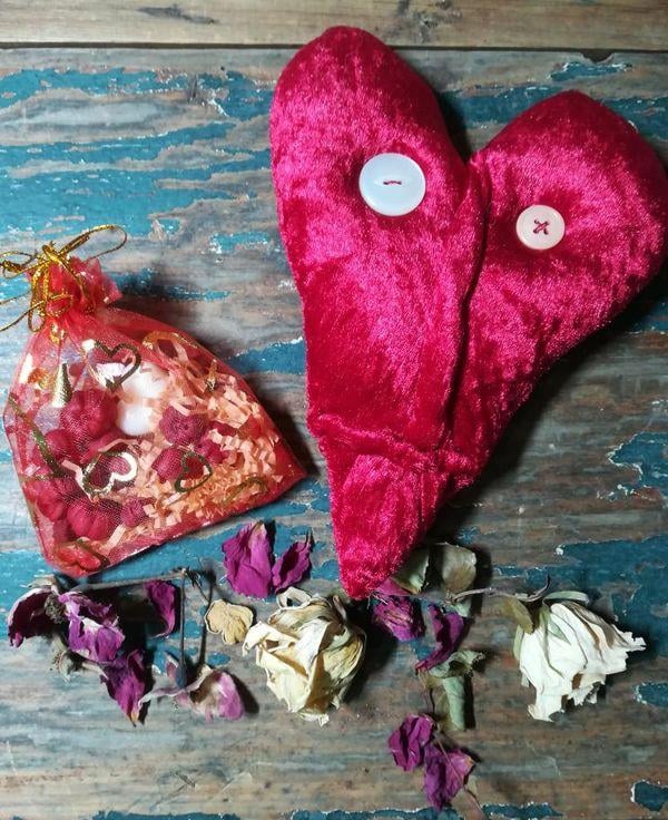 Each piece comes with a small organza bag with mini decorative red putna seeds and a 'Wild at Heart' wax melt heart (for use in wax burners)