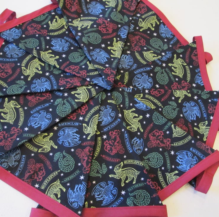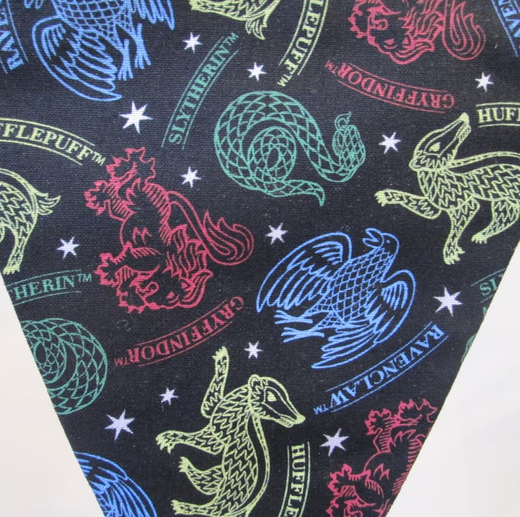 This bunting would be a beautiful addition to any home. Pennants made from 100% cotton fabric featuring the house emblems of Hogwarts. Ten flags, are arranged on red bias binding tape the same fabric is used for each side so it can be hung either way, pennants measure approximately six inches across and seven and three quarter inches to the point (15 cm x 20 cm). There is approximately a tape gap of 3.5 inches (9 cm) between each flag and about 15 inches (38 cm) of tape at each end to aid displaying. Overall this string of bunting measures approximately 10 ft 6 ins (3.2 m). Created in a smoke and pet free home, designed as a decoration not a toy.